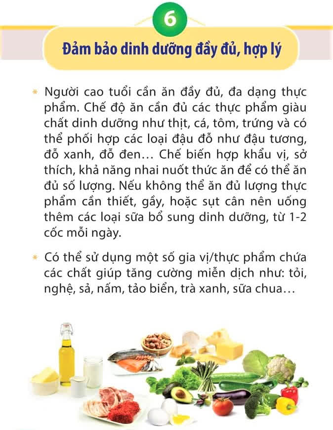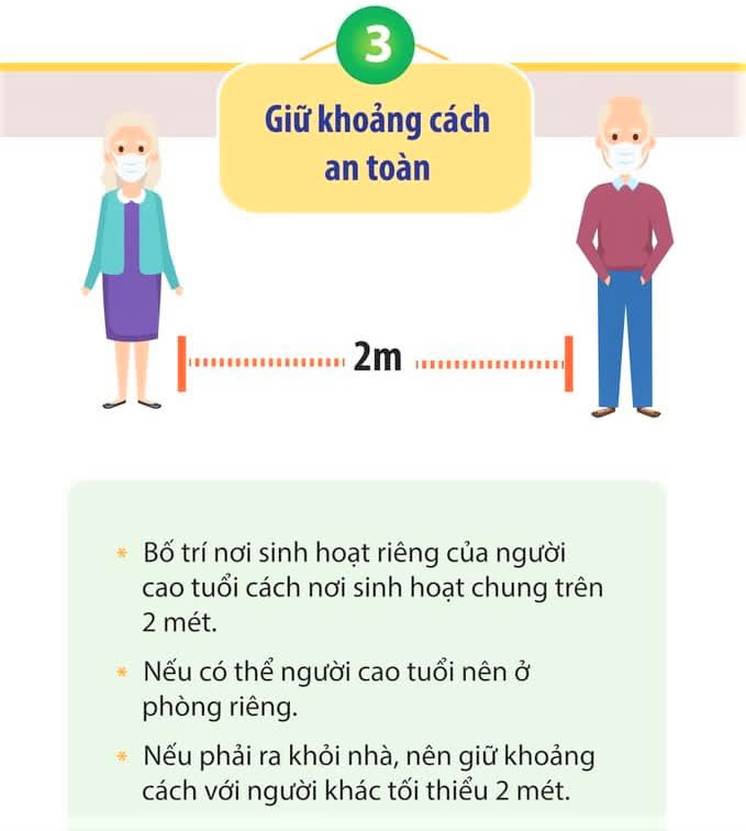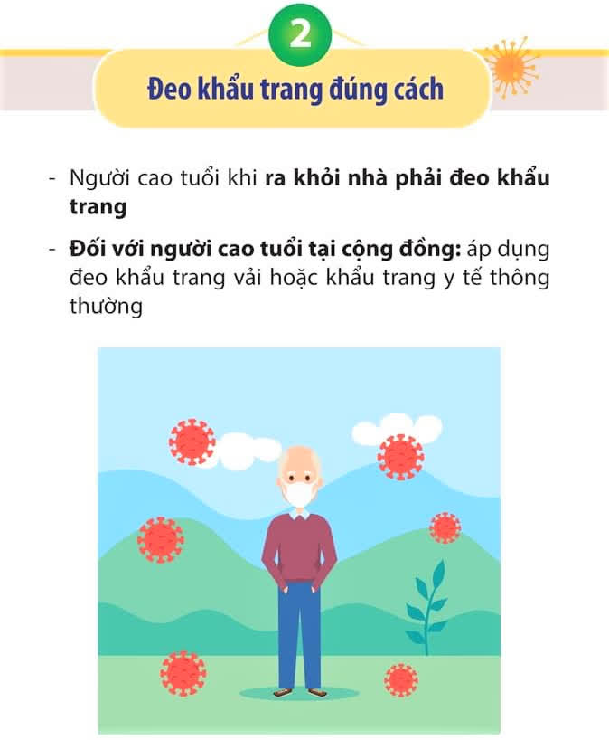 Trong đó, chú trọng phòng bệnh như: ở nhà, hạn chế tối đa ra ngoài, rửa tay, vệ sinh nơi ở, đeo khẩu trang, tránh tiếp xúc gần, thực hiện các giải pháp nâng cao thể trạng bằng liệu pháp dinh dưỡng, luyện tập, nâng cao đời sống tinh thần cũng như kiểm soát tốt các bệnh lý mạn tính hiện có giúp người cao tuổi đổi phó với dịch COVID-19 hiệu quả.