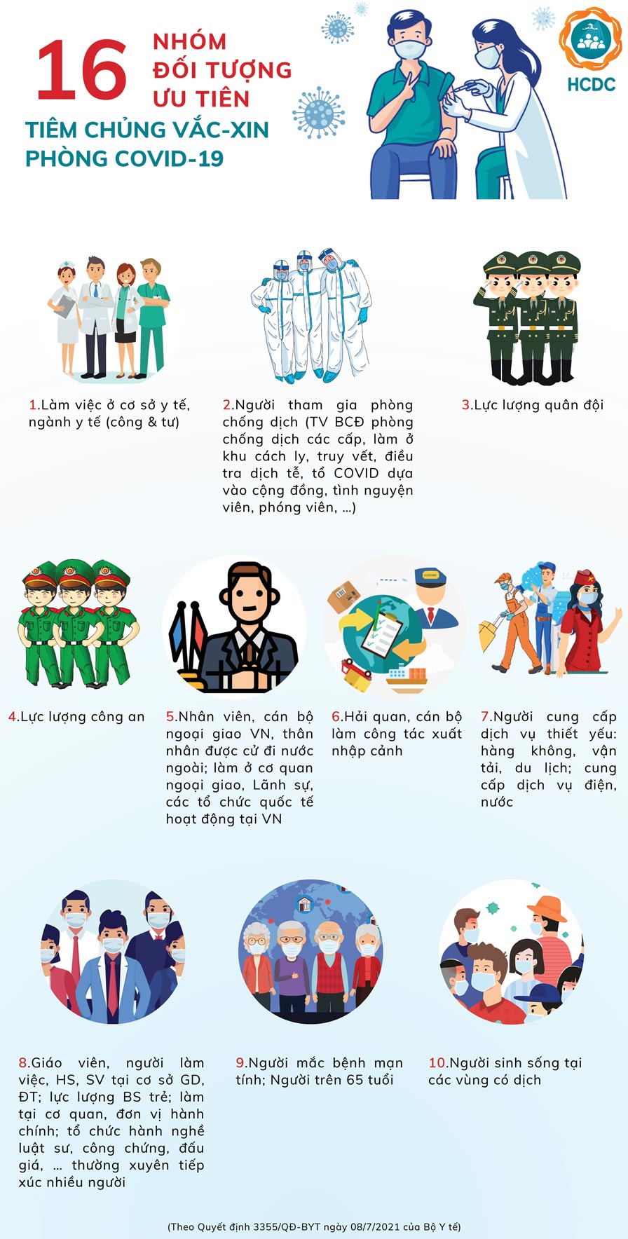 Vắc xin COVID-19 được cung cấp miễn phí, tự nguyện cho tất cả mọi người từ 18 tuổi trở lên. Theo Quyết định 2995/QĐ-BYT của Bộ Y tế ngày 18/6/2021 về việc Hướng dẫn tạm thời khám sàng lọc trước tiêm chủng vắc-xin phòng COVID-19: