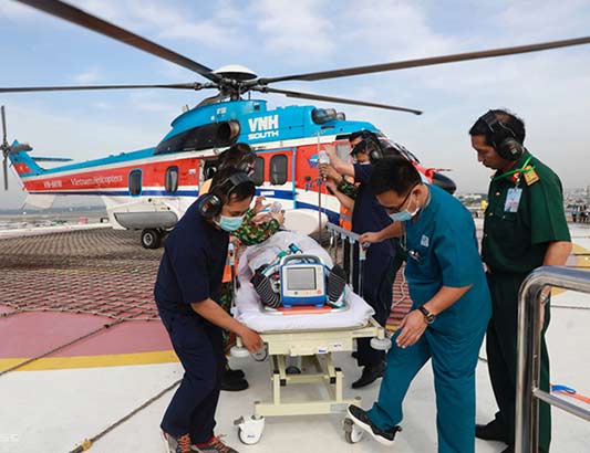 Trực thăng về từ Trường Sa đáp trên nóc toà nhà viên Chấn thương chỉnh hình, bệnh nhân được vận chuyển đến khu điều trị chỉ trong vòng vài phút.