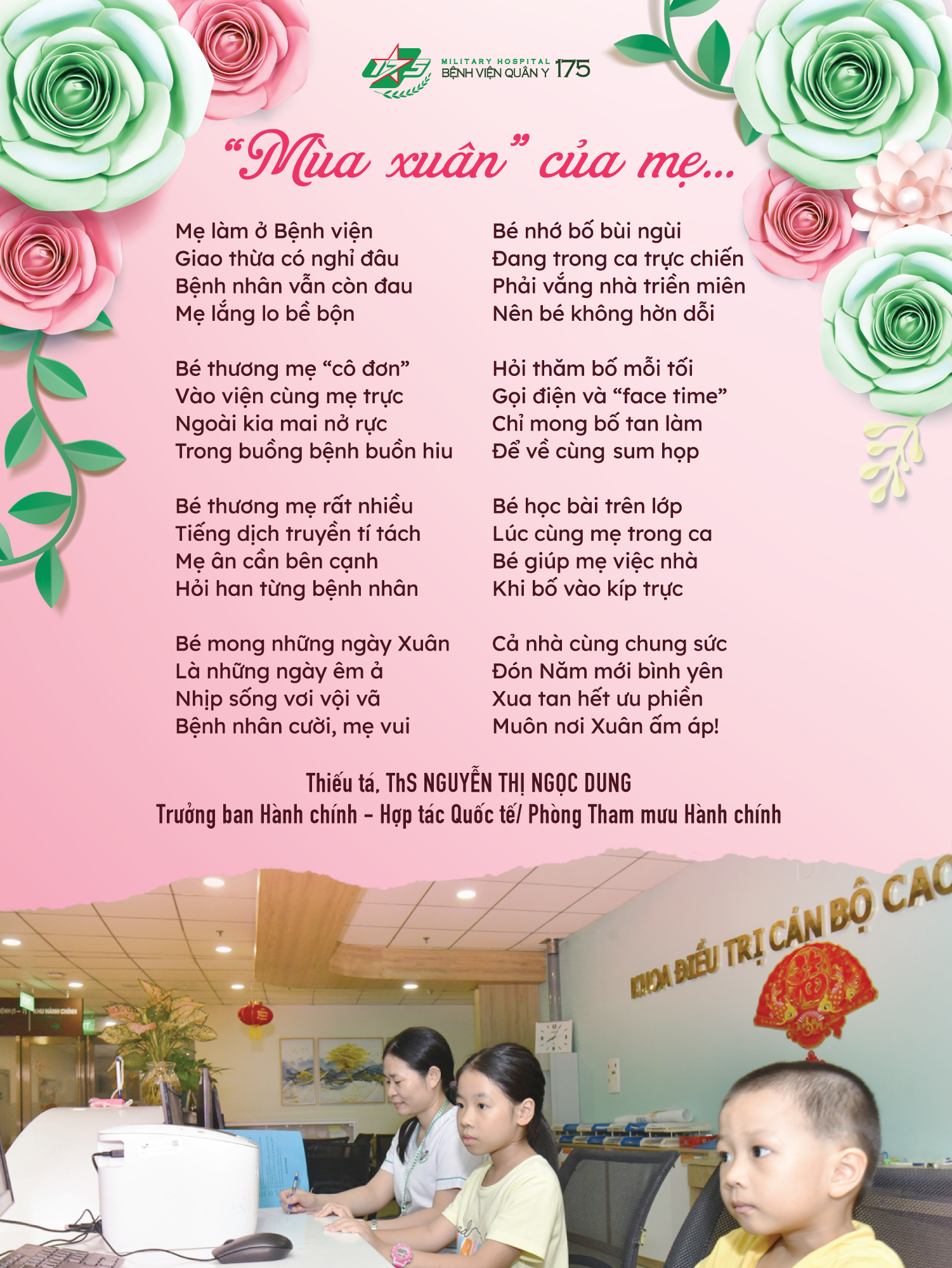 Với vai trò là người mẹ, vừa là người chăm sóc gia đình, cũng là một nữ chỉ huy, Thiếu tá, ThS Nguyễn Thị Ngọc Dung – Trưởng Ban Hành chính – Hợp tác Quốc tế, Phòng Tham mưu Hành chính đã gửi tặng những vầng thơ mộc mạc, với sự thấu hiểu, thông cảm và đầy yêu thương đến những nữ y, bác sĩ ngày đêm túc trực, luôn nỗ lực hoàn thành sứ mệnh chăm sóc sức khoẻ cho bệnh nhân tại Bệnh viện Quân y 175.