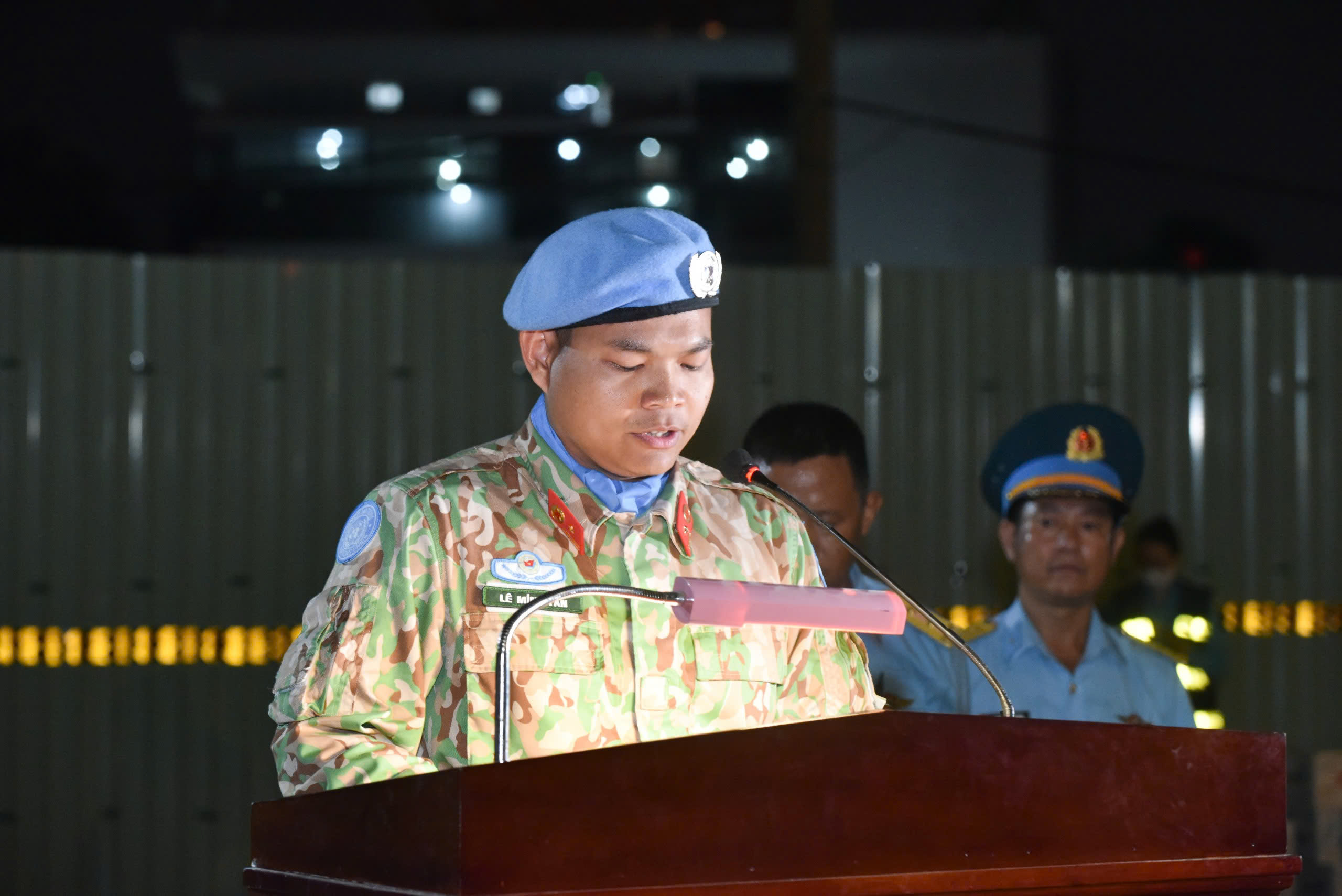Phát biểu tại buổi lễ, Thiếu tướng Trần Quốc Việt xúc động chia sẻ: “Hôm nay, chúng ta cùng nhau đón những người con ưu tú của đất nước trở về sau hành trình dài đầy ý nghĩa. Nhớ lại 14 tháng trước, cũng tại nơi này, chúng ta đã tiễn các đồng chí lên đường với bao niềm tin, hi vọng. Hôm nay, niềm vui nhân đôi khi 51 đồng chí đã bình an trở về, đủ cả. Chúng tôi tin rằng, 12 đồng chí còn lại cũng sẽ sớm đoàn tụ cùng đại gia đình. Thay mặt toàn thể cán bộ, nhân viên bệnh viện, tôi xin gửi lời cảm ơn sâu sắc đến các đồng chí đã hoàn thành xuất sắc nhiệm vụ, góp phần bảo vệ hòa bình thế giới.”