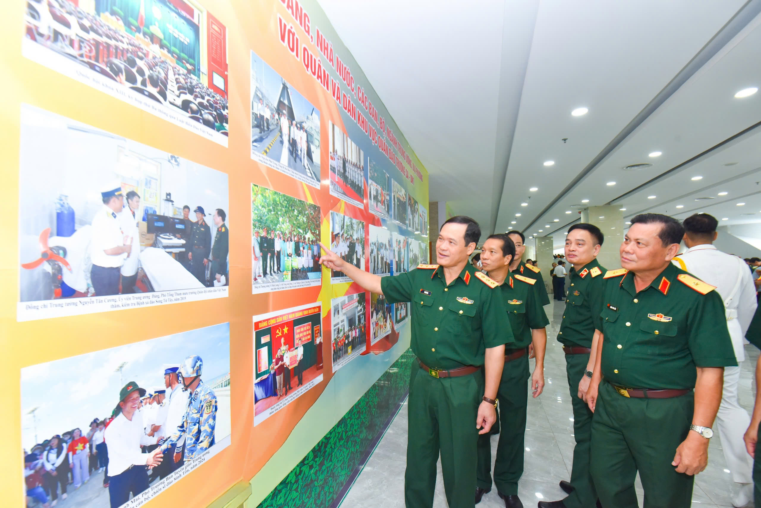 Thủ trưởng Bộ Quốc phòng và các đại biểu tham quan trưng bày hình ảnh về huyện đảo Trường Sa, Khánh Hòa
