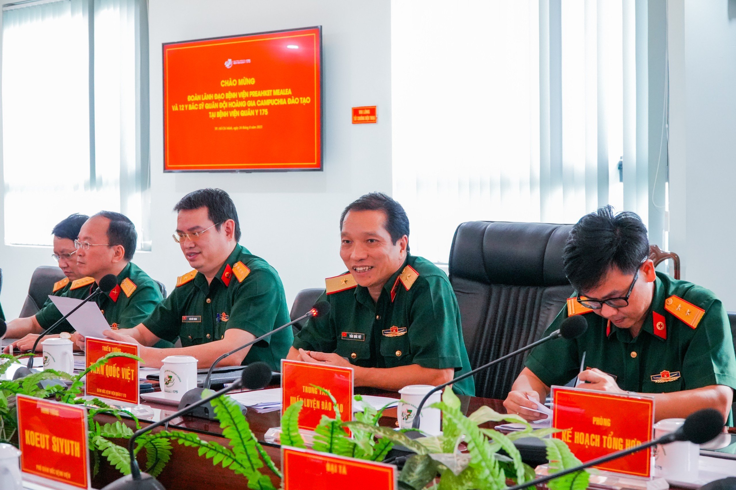 Tại buổi làm việc, hai bên đã trao đổi và đánh giá lại công tác phối hợp, hỗ trợ chuyên môn khám chữa bệnh từ năm 2018-2022. Trong 5 năm, Bệnh viện Quân y 175 đã hỗ trợ đào tạo và cấp chứng nhận cho 30 học viên là các bác sĩ Quân đội Hoàng gia Campuchia với các chuyên ngành: Tim mạch, da liễu, ngoại tiêu hóa, gây mê hồi sức, chẩn đoán hình ảnh, tiêu hoá, ngoại thần kinh, ngoạ tiết niệu…với thời gian đào tạo mỗi đợt 6 tháng. Kết quả đào tạo đã góp phần nâng cao chất lượng, trình độ công tác chuyên môn các chuyên ngành của các bác sĩ khi về công tác tại các Bệnh viện trong Quân đội Hoàng gia Campuchia.