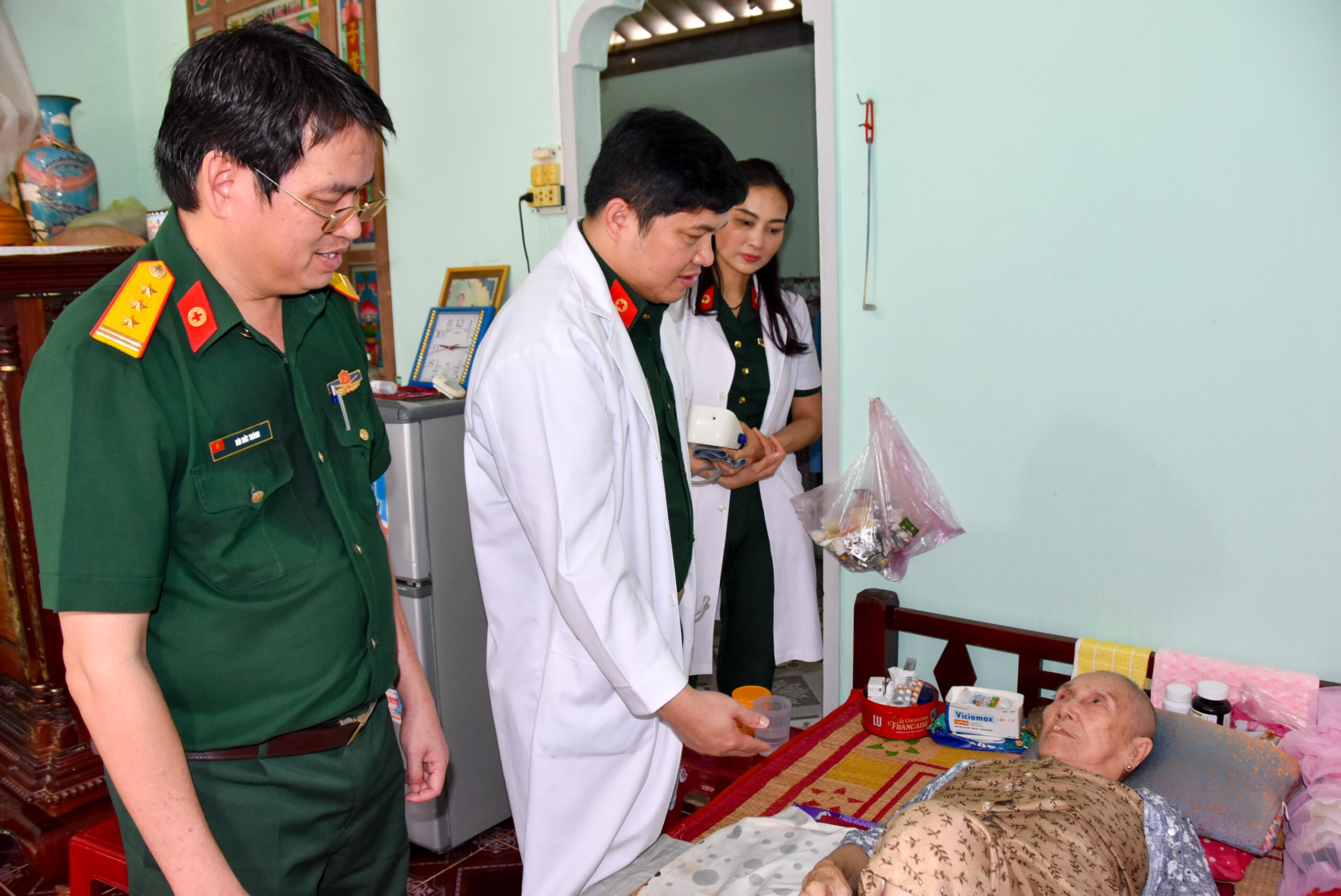 Lãnh đạo Bệnh viện Quân y 175 và các y bác sĩ thăm khám Bà mẹ Việt Nam anh hùng Võ Thị Hỏi, ngụ tại xã Quơn Long, huyện Chợ Gạo