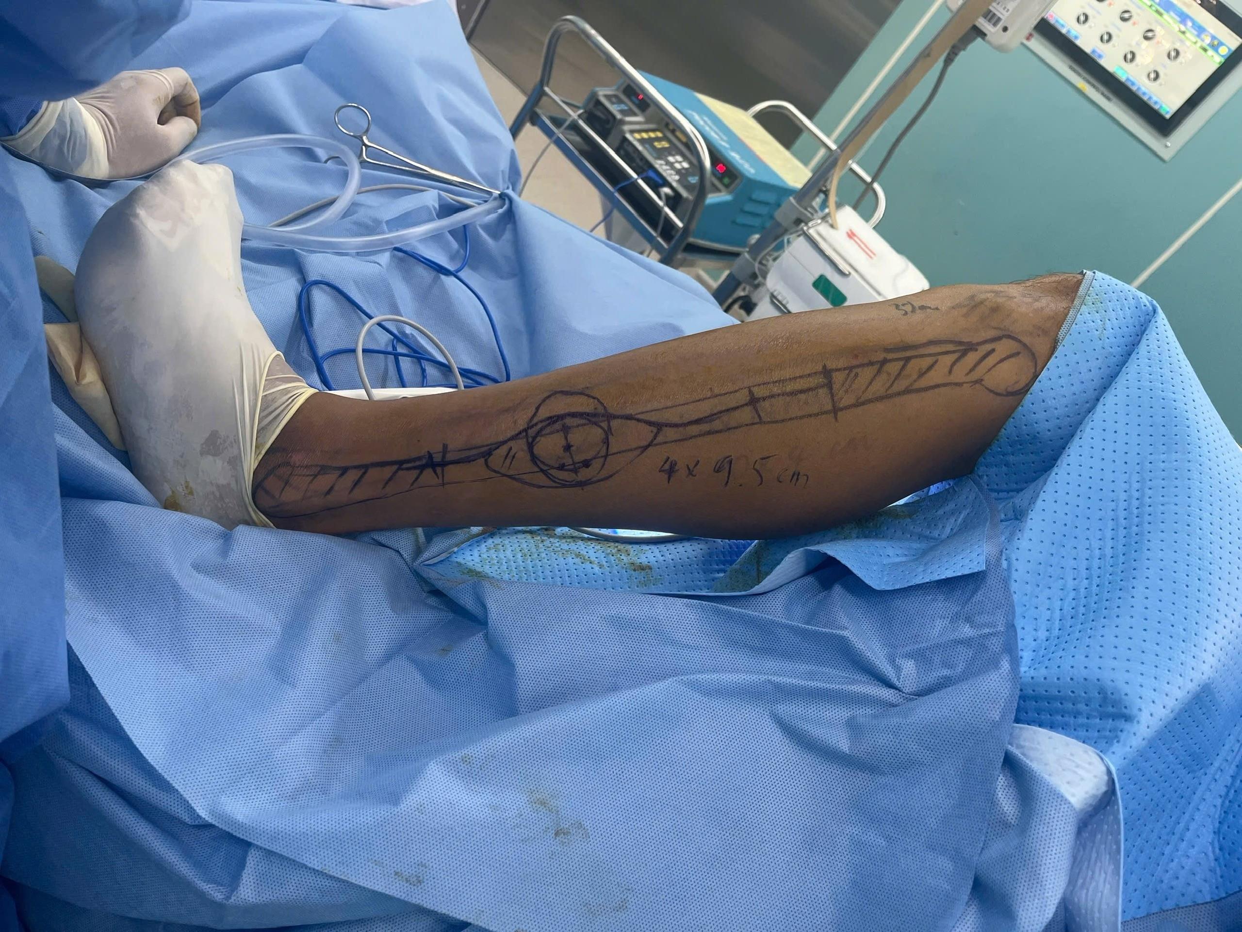Vạt da xương mác, sau cắt, cố định vào nẹp tạo hình đã thiết kế.