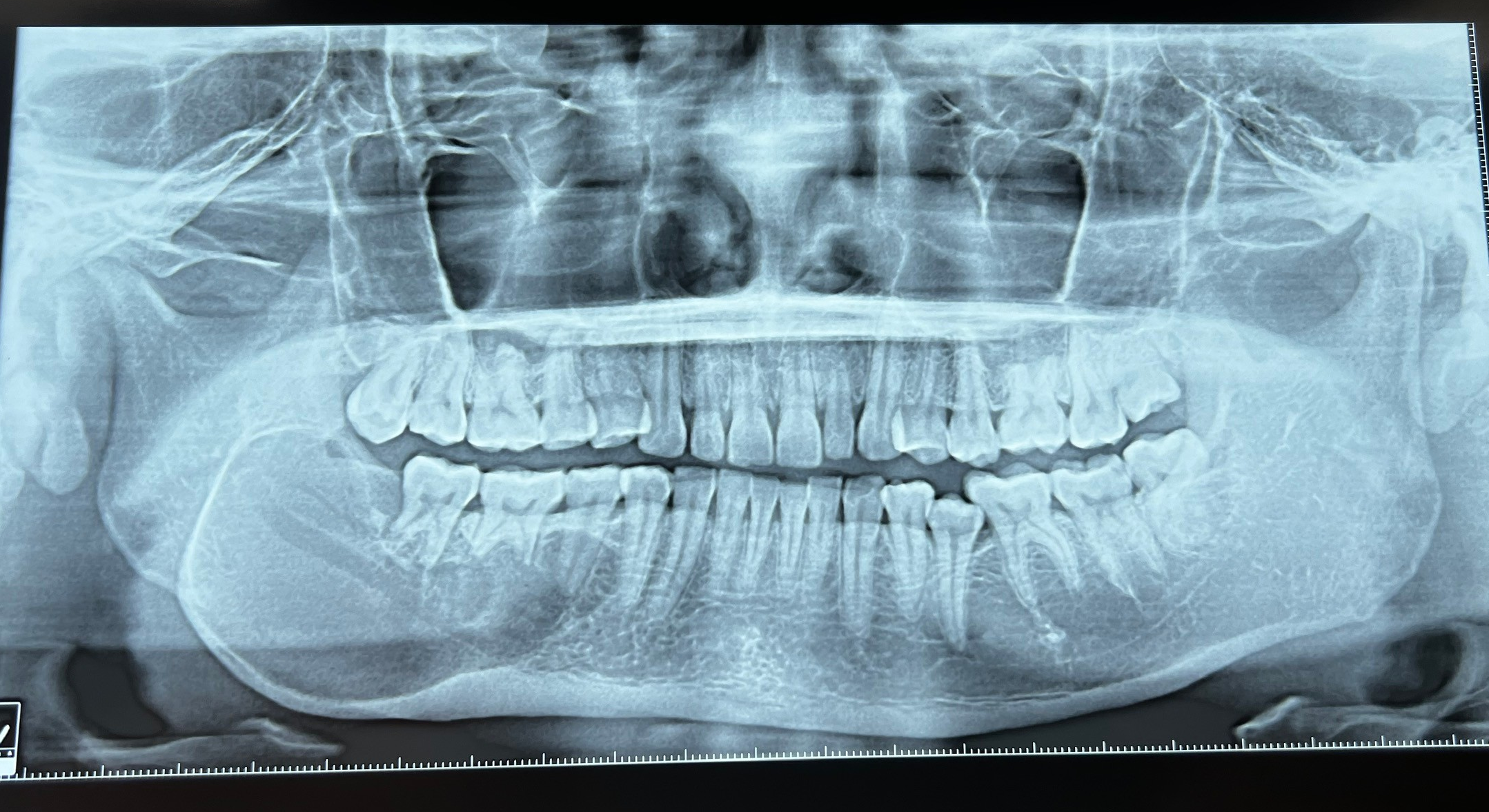 Hình chụp XQ Panorama: hình ảnh thấu quang đơn hốc ở thân xương hàm dưới (P), từ răng 44 đến ngành lên xương hàm dưới (P). R47,46 tiêu chân răng dạng bờ dao cắt.