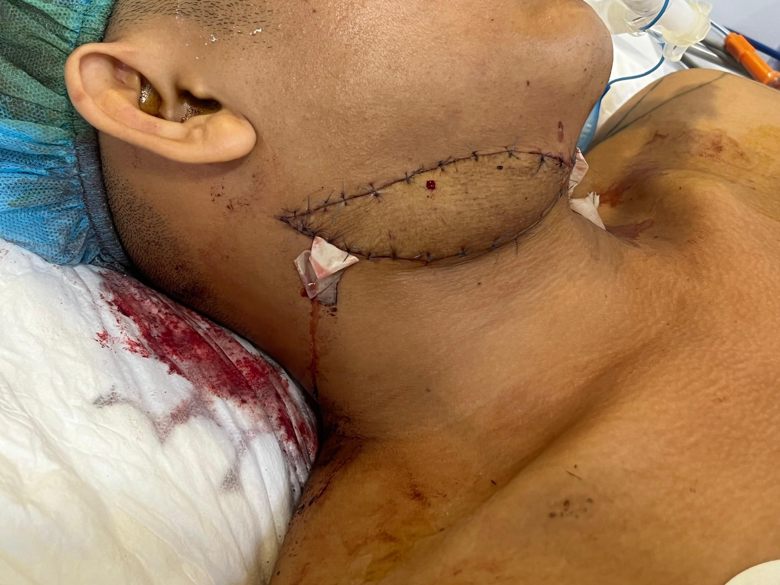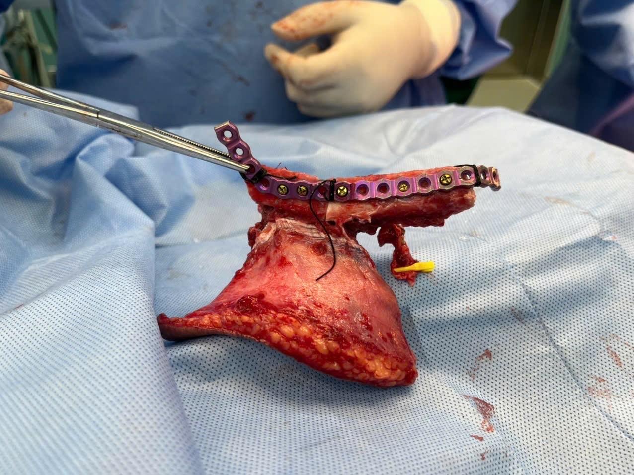 Bệnh nhân được phẫu thuật cắt đoạn xương hàm dưới, loại bỏ khối u với lề cắt an toàn 1cm, đồng thời tái tạo xương hàm dưới bằng vạt da cơ xương mác tự do. Đây là một kỹ thuật phức tạp, yêu cầu sự điêu luyện, tỉ mỉ và sức bền từ êkip phẫu thuật. Tuy nhiên, phương pháp này được hỗ trợ bởi công nghệ 3D, giúp các bác sĩ mô phỏng chính xác từng thao tác cắt, ghép và tái tạo. Nhờ đó, kết quả phẫu thuật được tối ưu hóa về cả mặt chức năng và thẩm mỹ, mang lại sự hiệu quả vượt trội cho bệnh nhân.