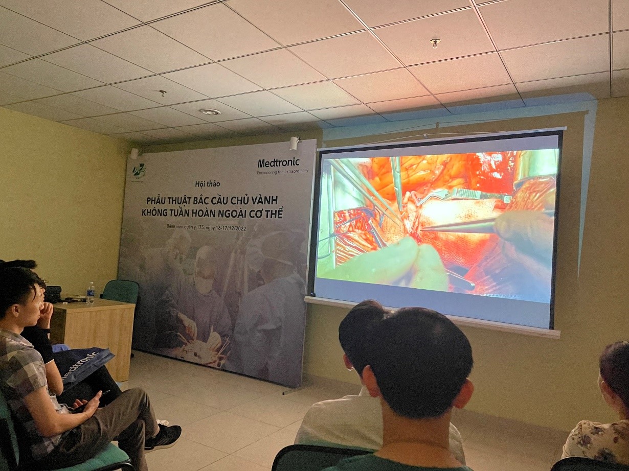 Ngoài ra, các bác sỹ tham dự còn được xem truyền hình trực tiếp 02 ca bệnh được thực hiện phẫu thuật tại phòng mổ Bệnh viện Quân y 175 do các chuyên gia đầu ngành đến từ Viện tim Tp HCM và Bệnh viện Quân y 175 trực tiếp phẫu thuật.