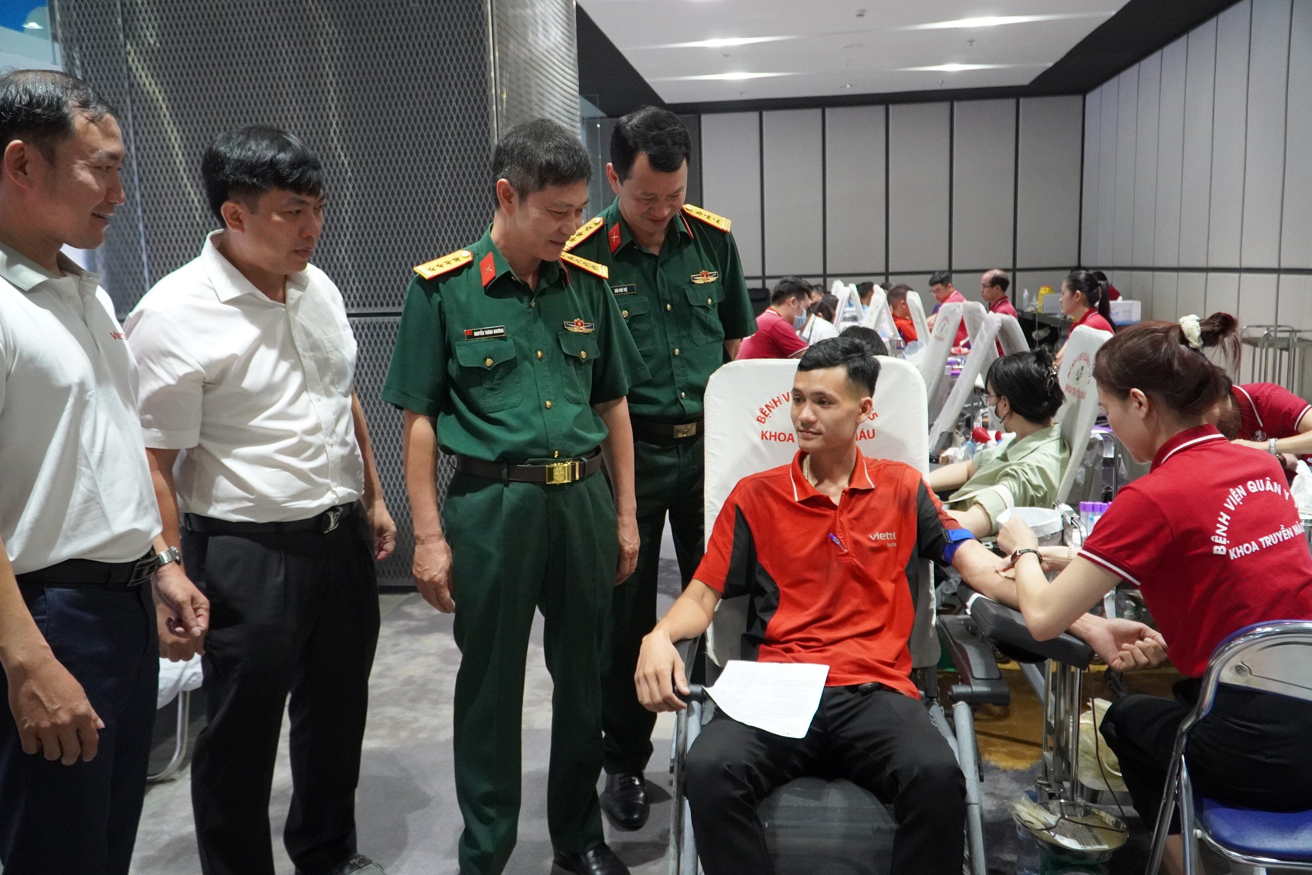 Đại tá Nguyễn Thành Nhương, Trưởng đại diện Văn phòng miền Nam của Viettel và Thượng tá Bùi Phú Tuệ, Phụ trách Phó chủ nhiệm Chính trị Bệnh viện Quân y 175 trò chuyện, động viên cán bộ, nhân viên Viettel hiến máu