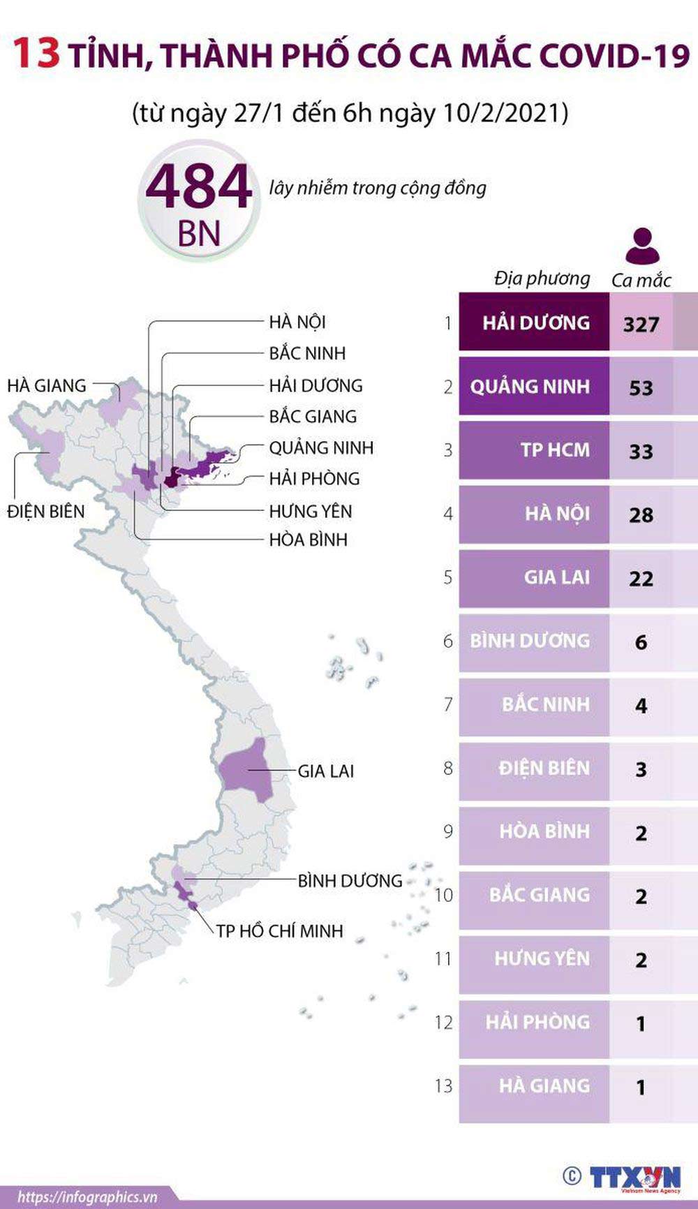 13 tỉnh, thành phố có ca mắc COVID-19 (từ ngày 27/1 đến 6h ngày 10/2/2021):