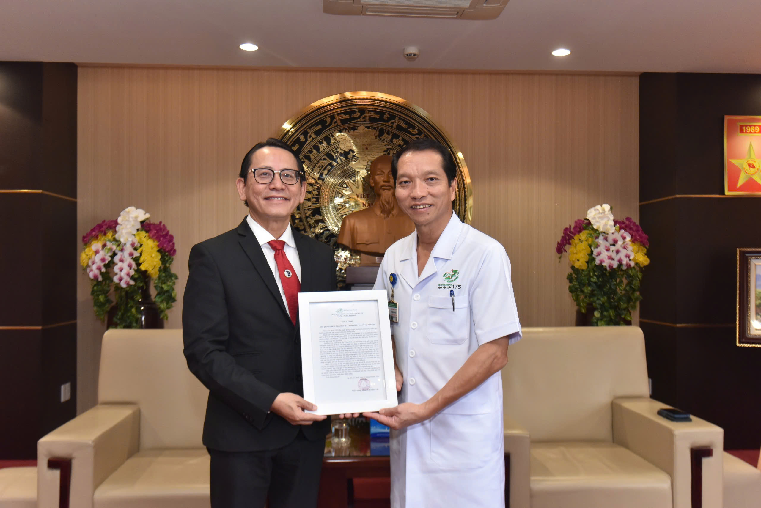 Thiếu tướng, TS.TTND Trần Quốc Việt – Giám đốc Bệnh viện trao tặng thư cảm ơn tri ân đến GS.TSKH Dương Quý Sỹ