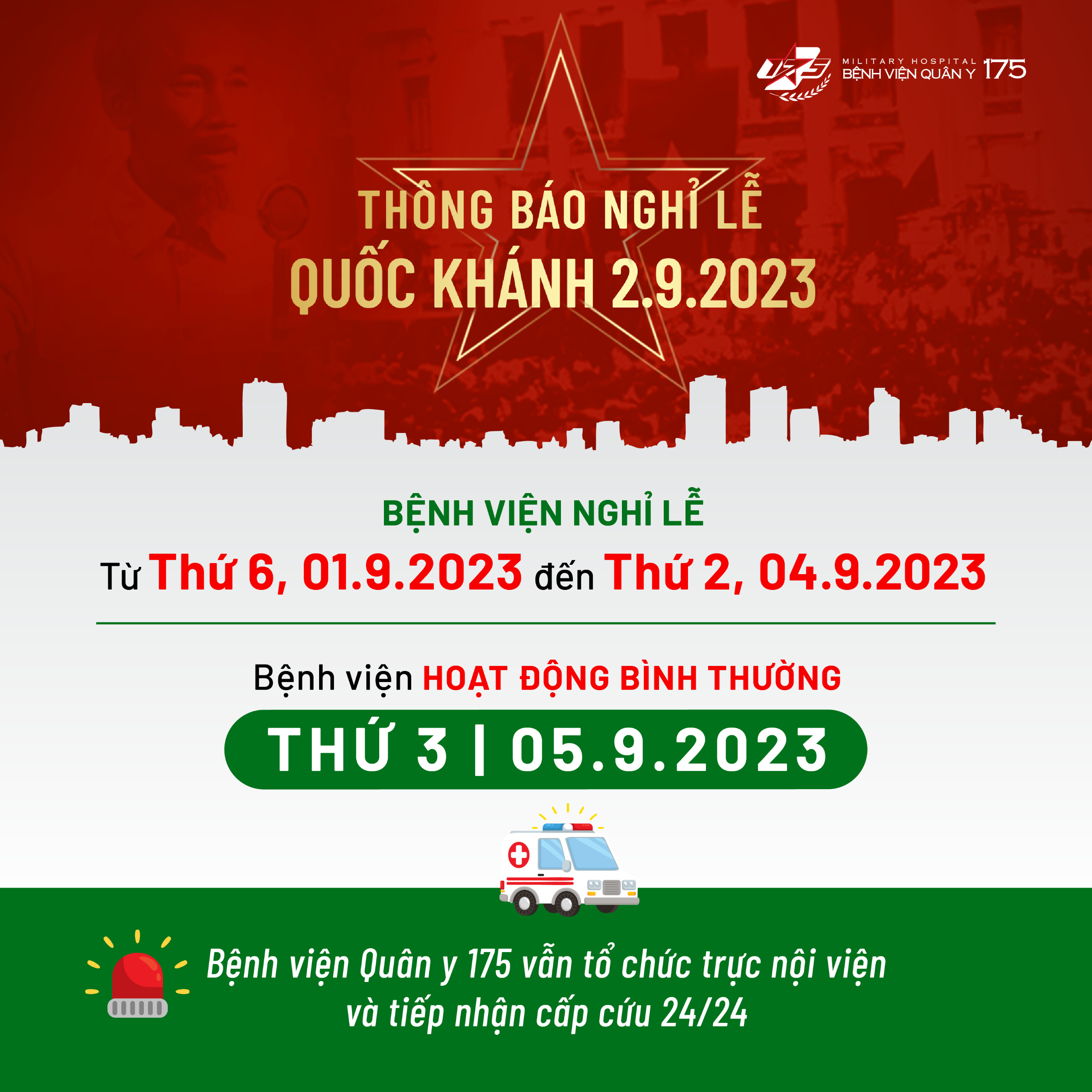 Bệnh viện Quân y 175 xin trân trọng thông báo đến Quý khách hàng, người bệnh và các đối tác lịch nghỉ lễ Quốc Khánh năm 2023: