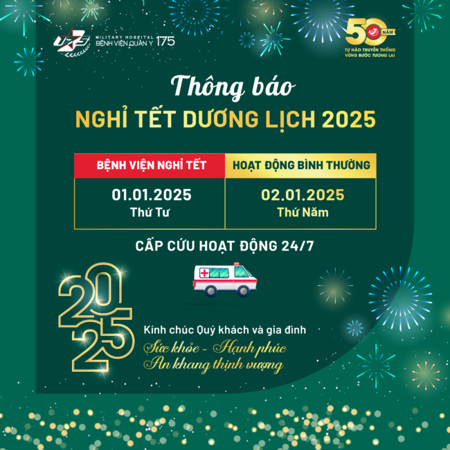 Bệnh viện Quân y 175 trân trọng thông báo tới Quý khách hàng, Quý đối tác lịch nghỉ Tết Dương lịch năm 2025 như sau: