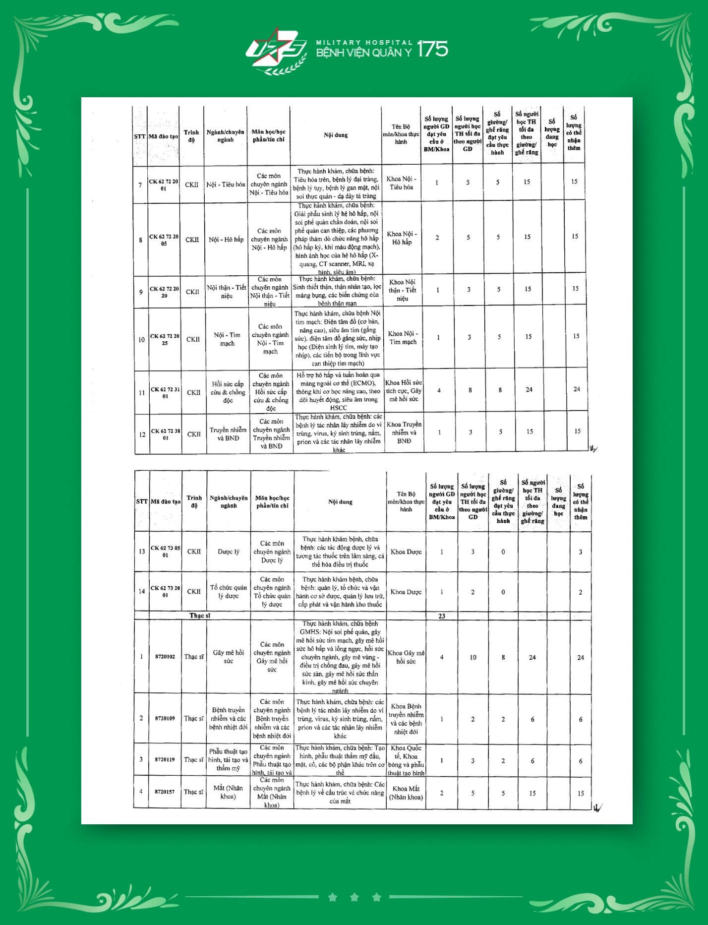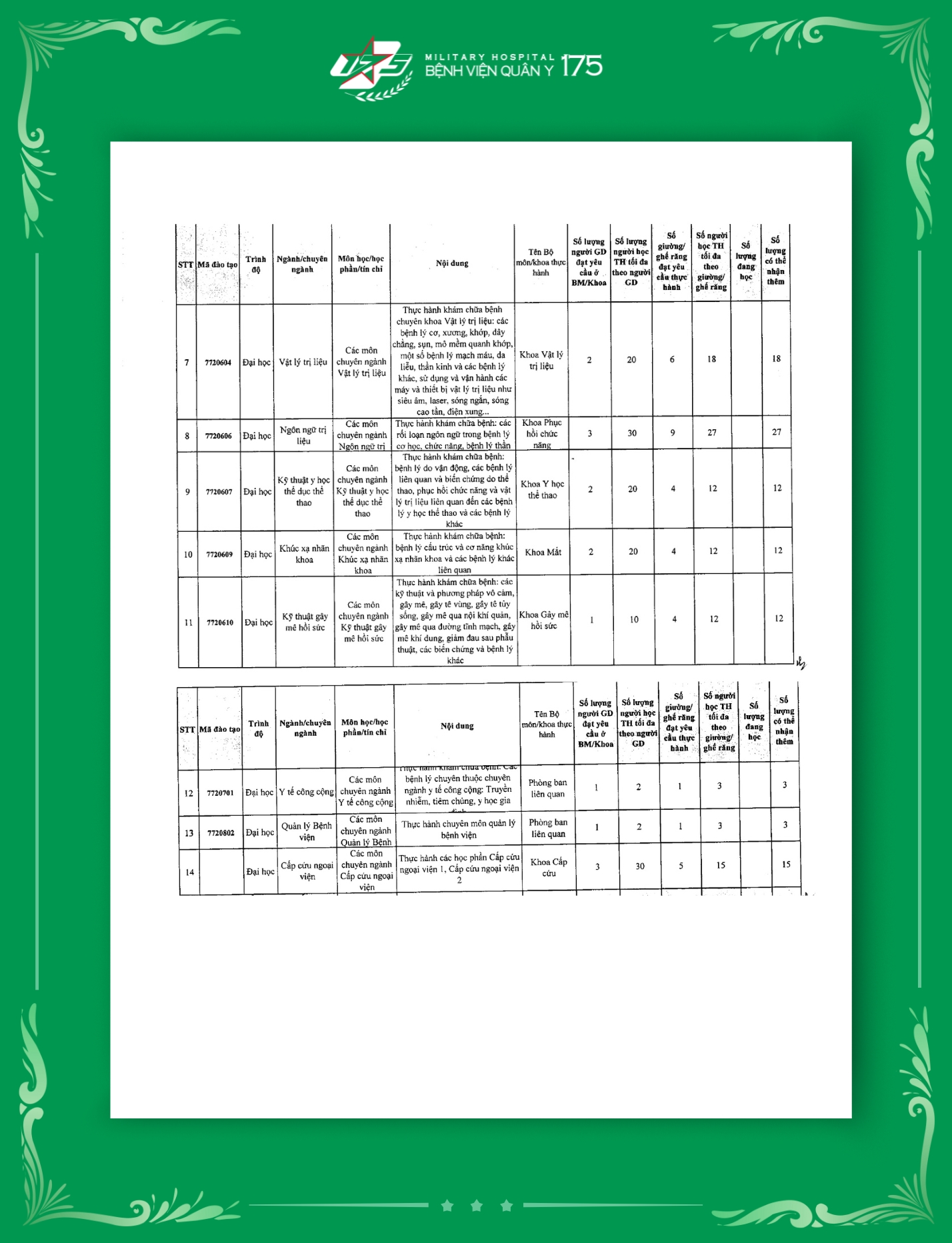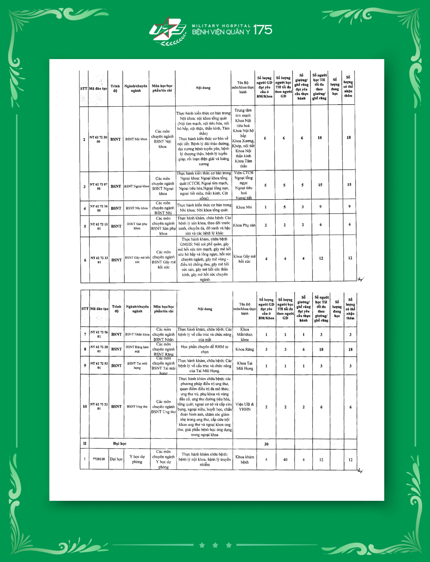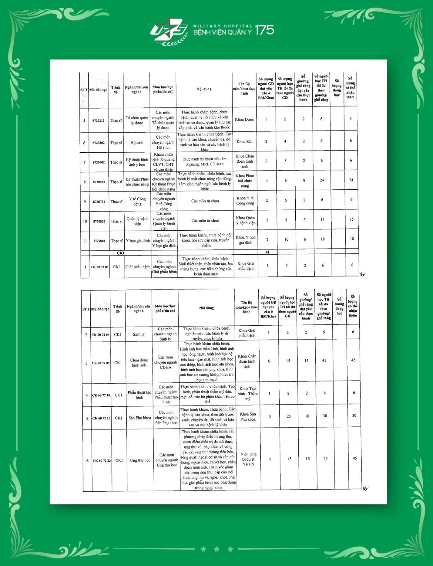 Tính đến thời điểm hiện tại, Bệnh viện Quân y 175 đã hoàn thiện công bố tổng cộng 129 mã ngành đào tạo thuộc nhiều trình độ khác nhau. Đây là cơ sở quan trọng để Bệnh viện mở rộng hoạt động đào tạo, bồi dưỡng cán bộ chuyên môn, nâng cao năng lực y học quân sự, góp phần đảm bảo chất lượng khám chữa bệnh và chăm sóc sức khỏe cho bộ đội và nhân dân.