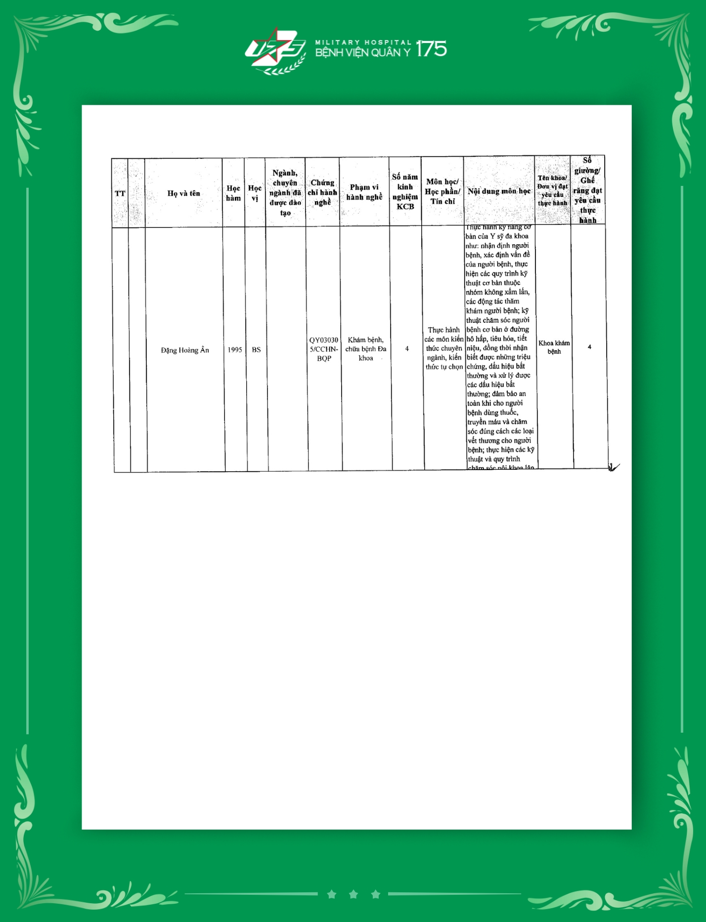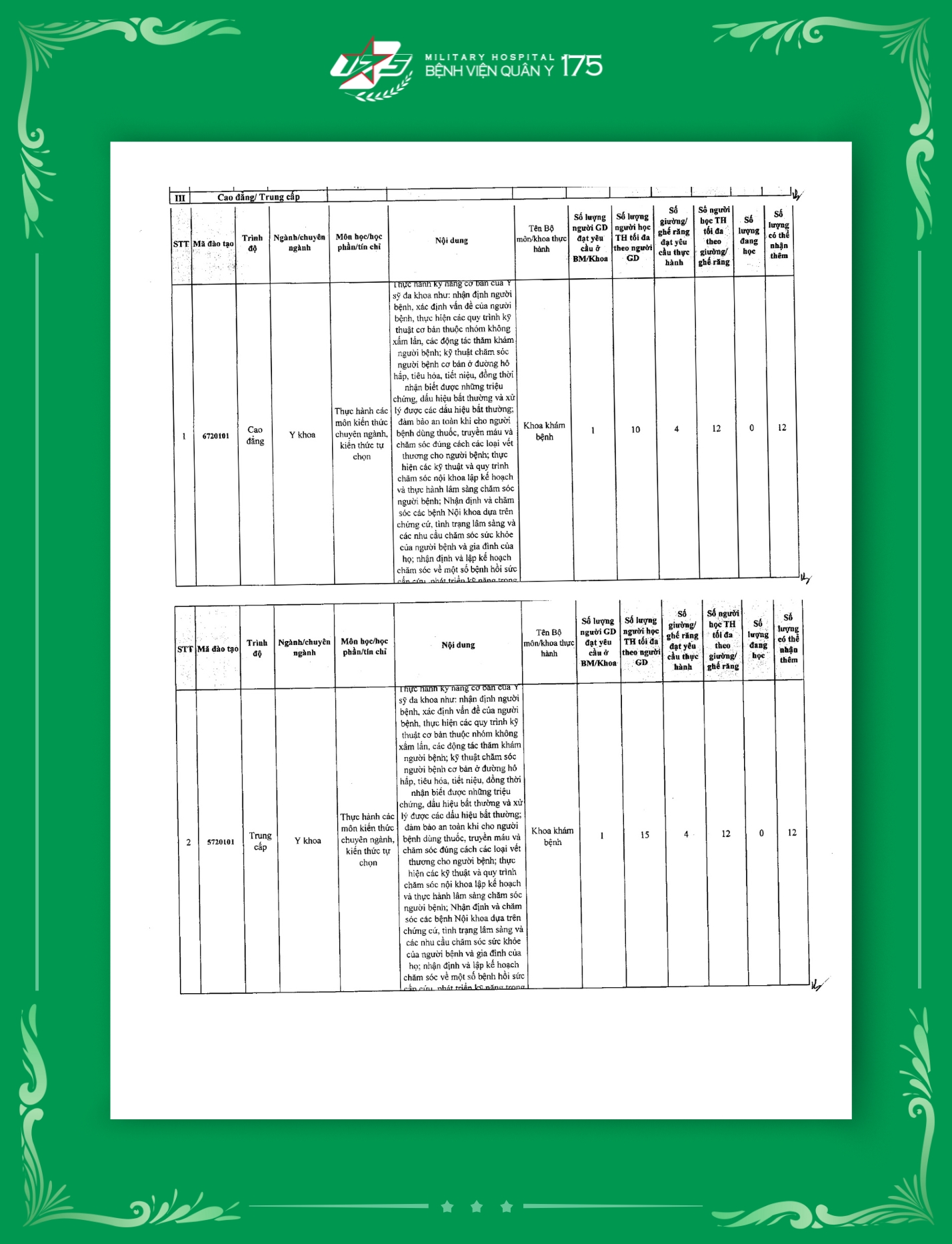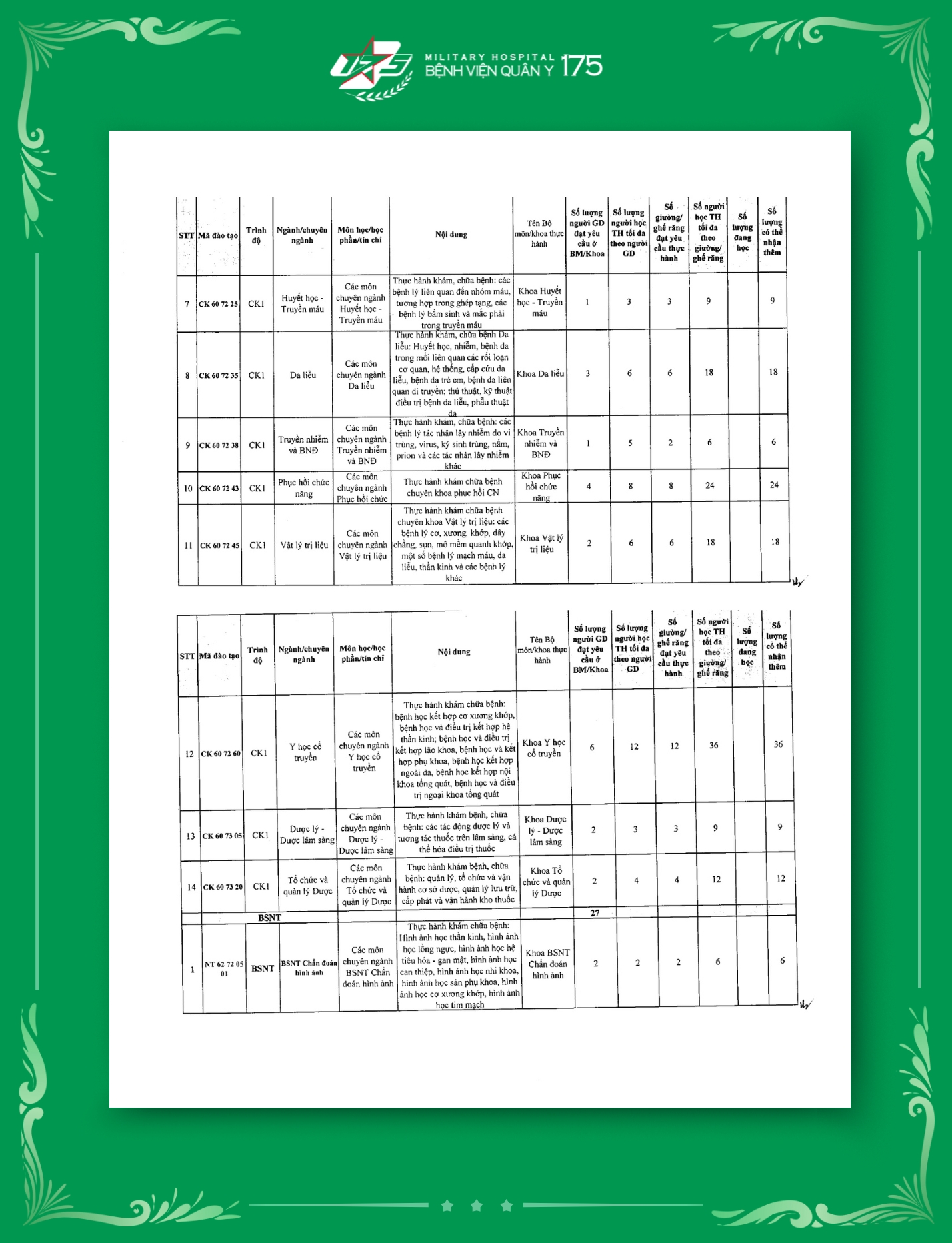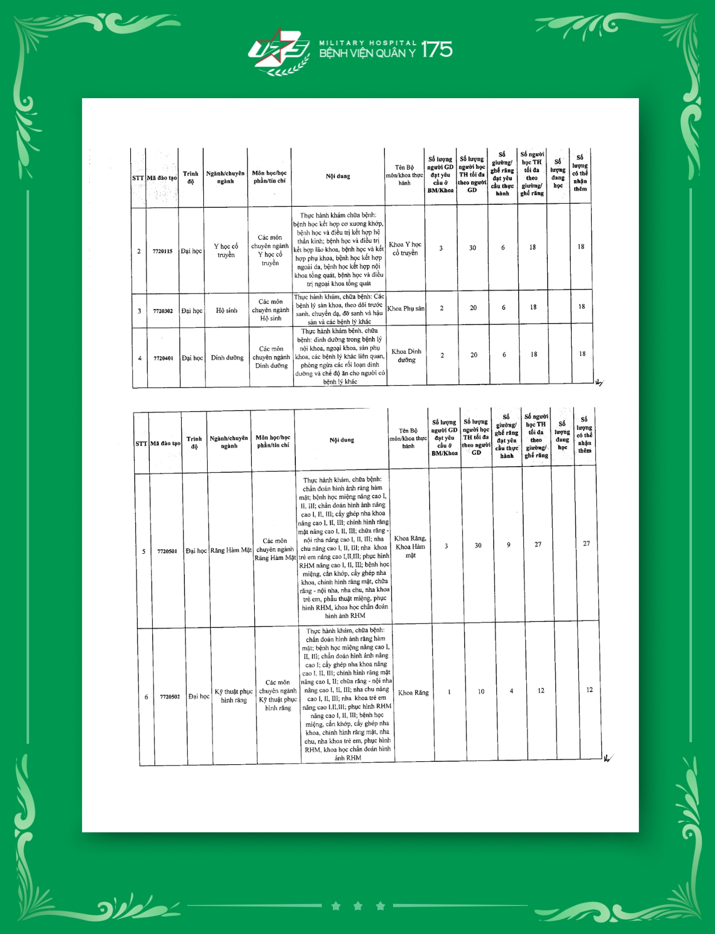 Tính đến thời điểm hiện tại, Bệnh viện Quân y 175 đã hoàn thiện công bố tổng cộng 129 mã ngành đào tạo thuộc nhiều trình độ khác nhau. Đây là cơ sở quan trọng để Bệnh viện mở rộng hoạt động đào tạo, bồi dưỡng cán bộ chuyên môn, nâng cao năng lực y học quân sự, góp phần đảm bảo chất lượng khám chữa bệnh và chăm sóc sức khỏe cho bộ đội và nhân dân.