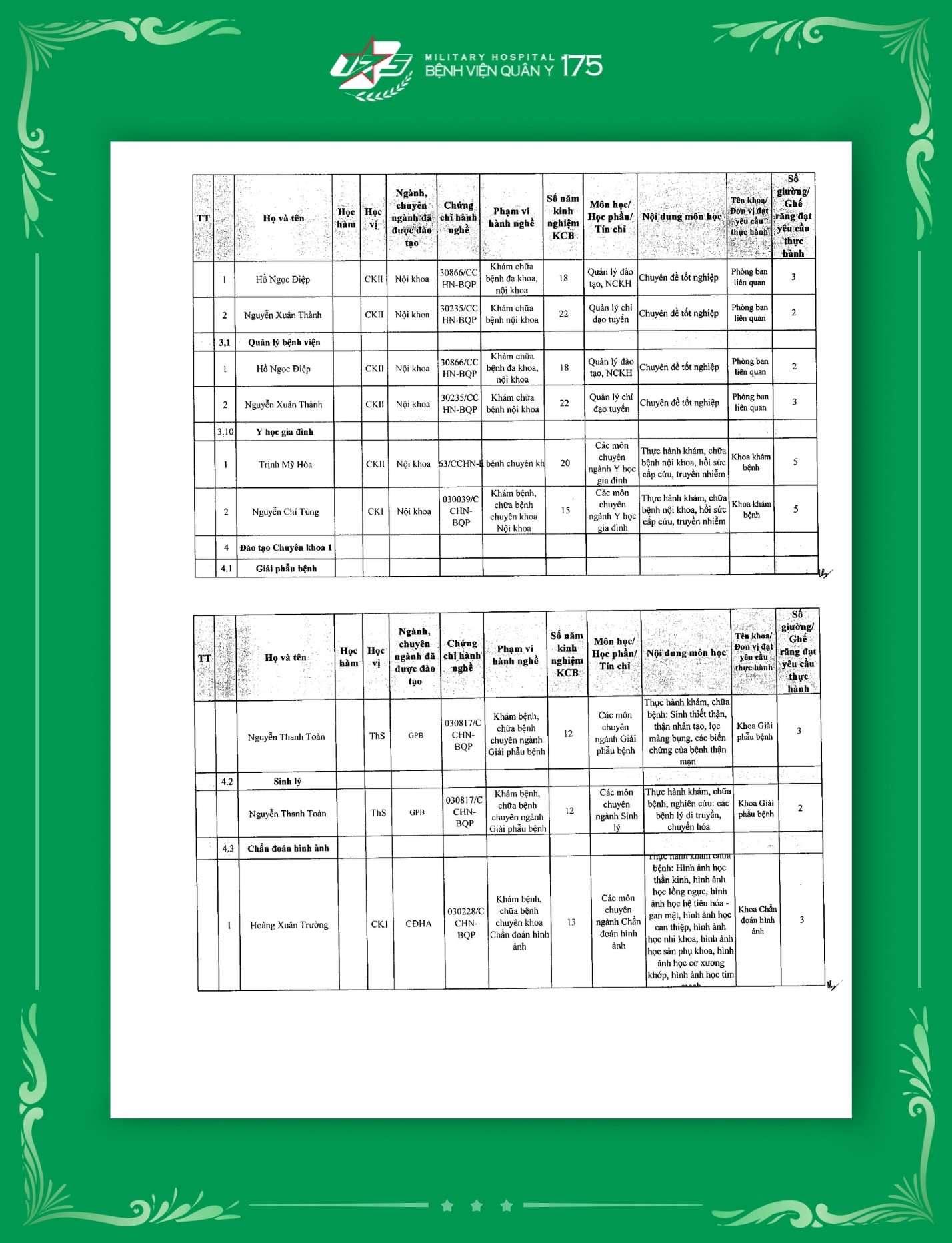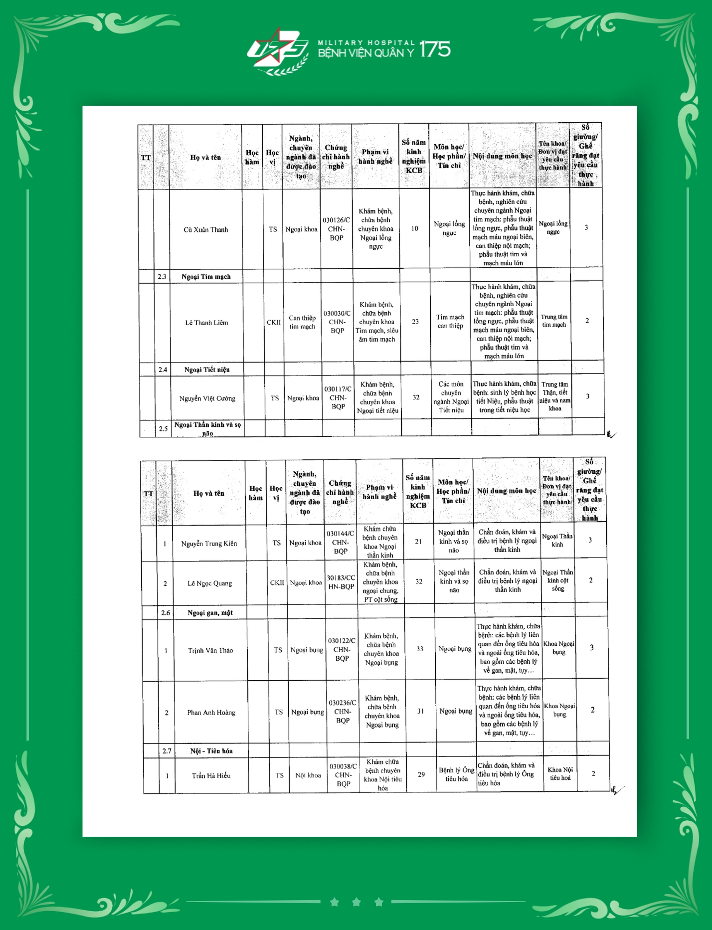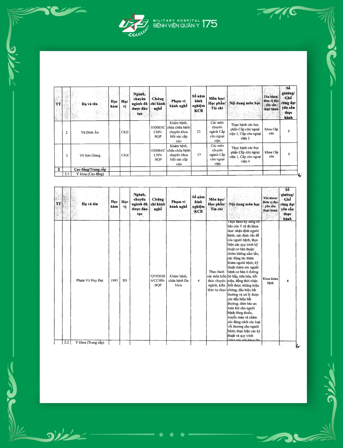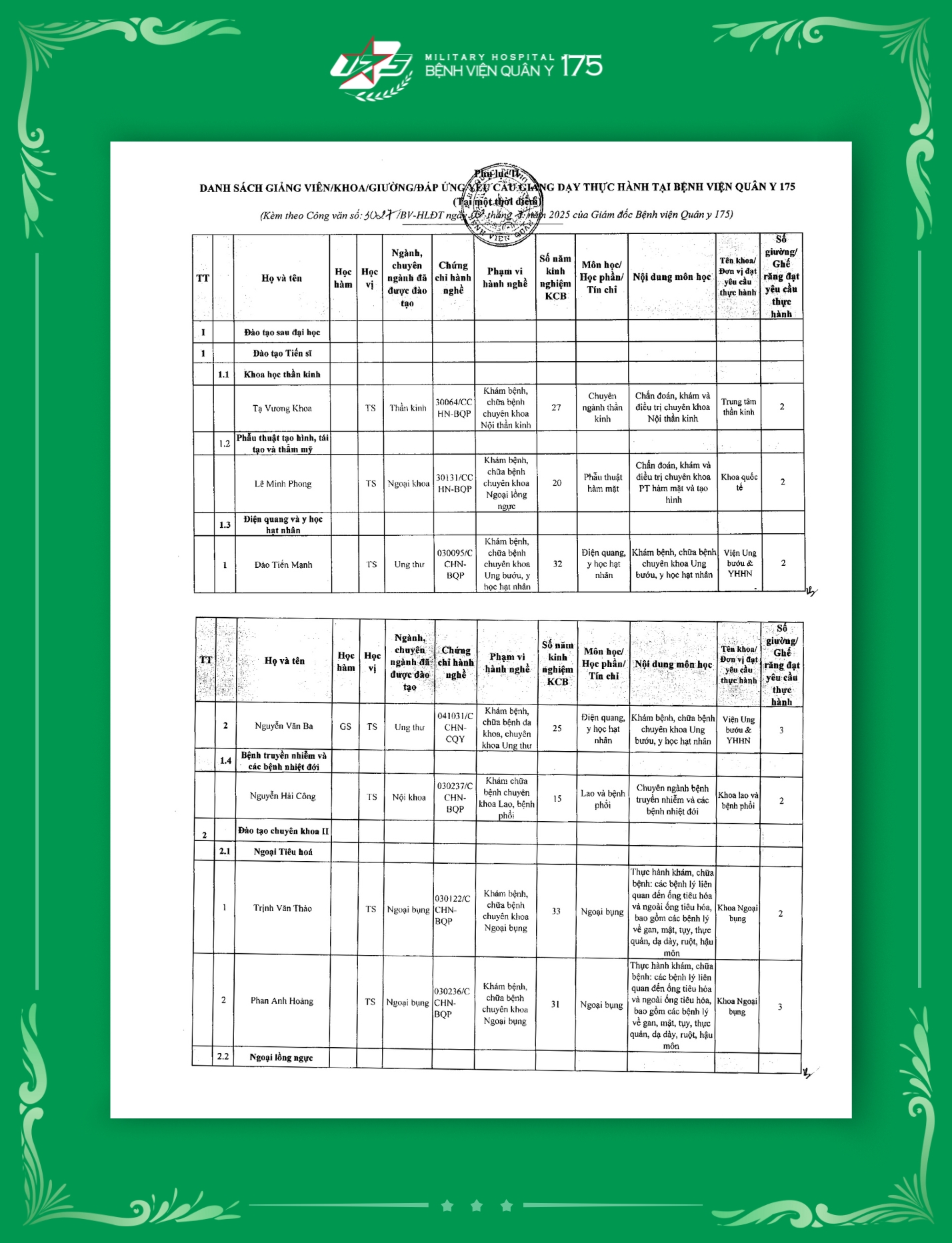 Phụ lục 2: Danh sách Giảng viên / Khoa / Giường / Đáp ứng yêu cầu giảng dạy thực hành tại Bệnh viện Quân y 175