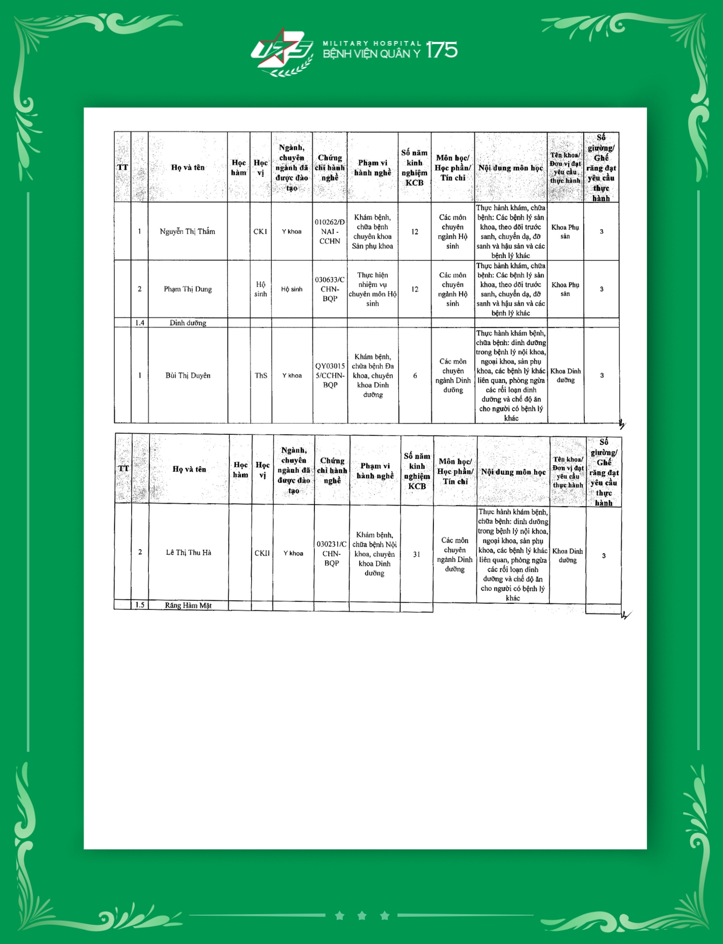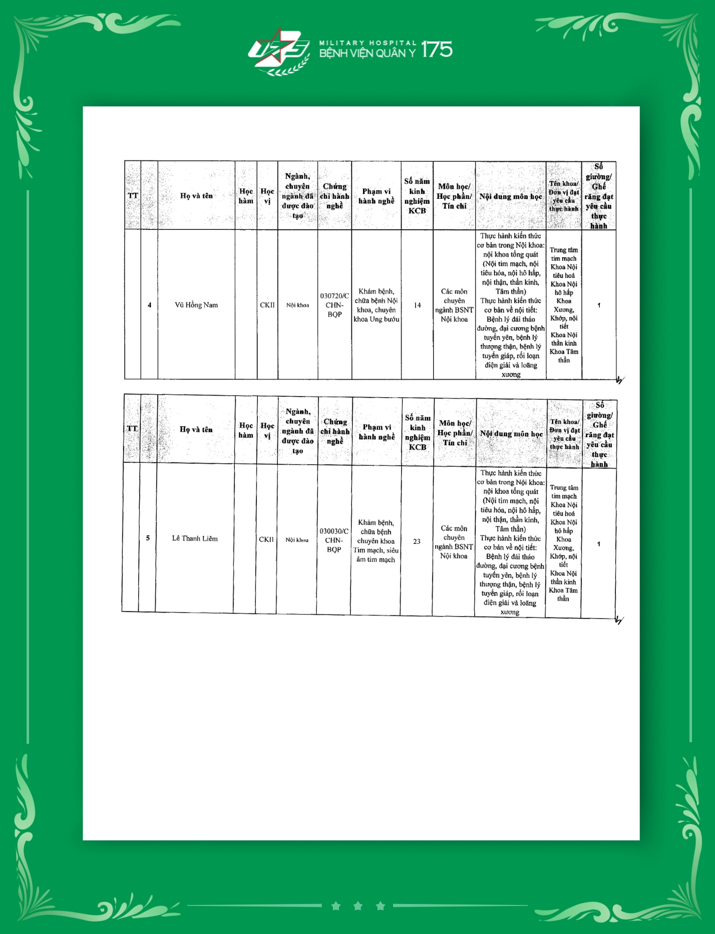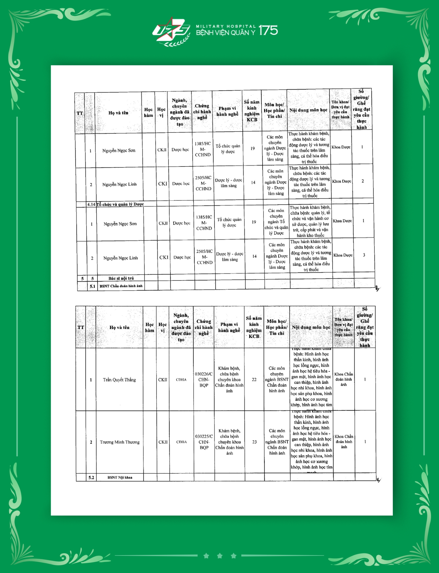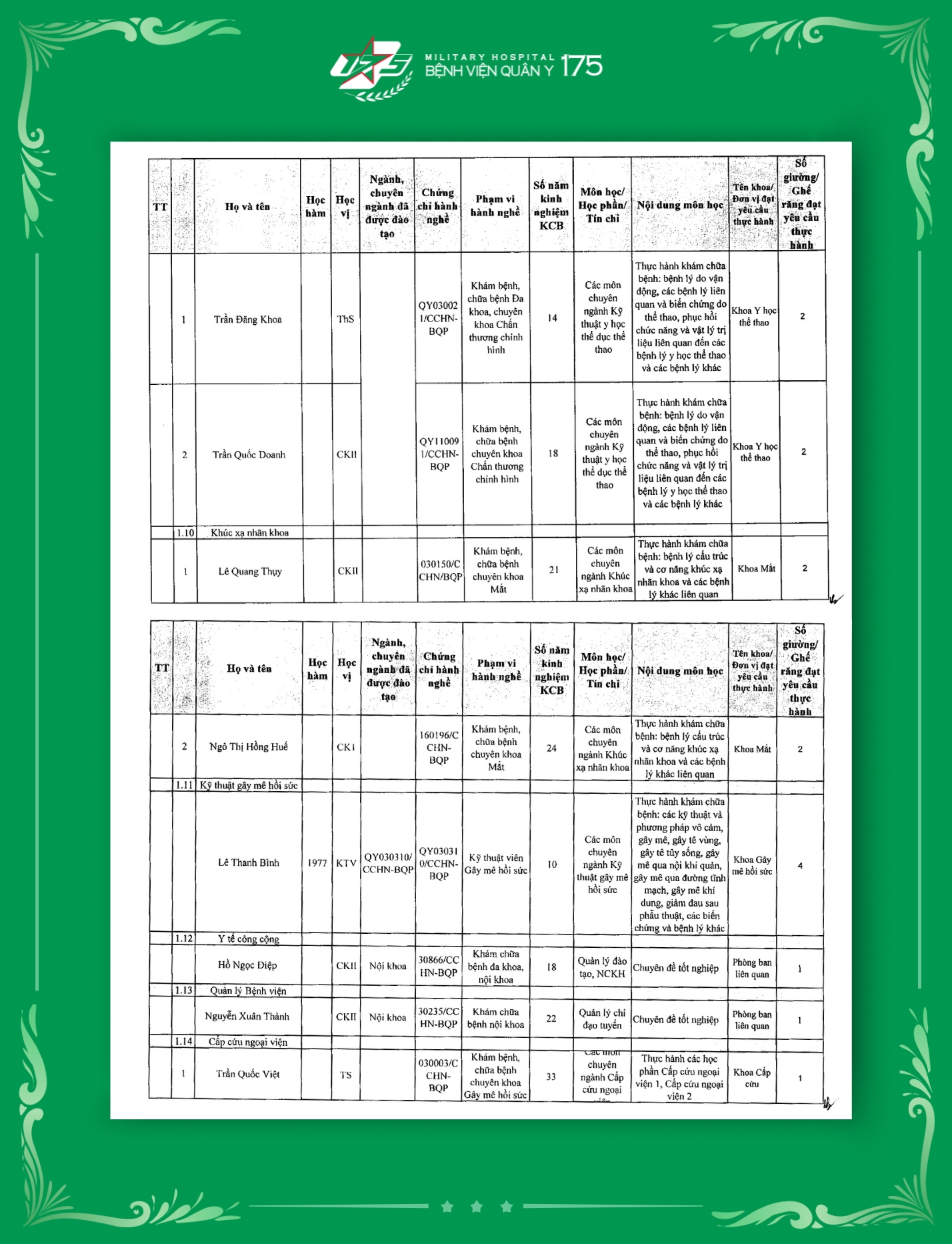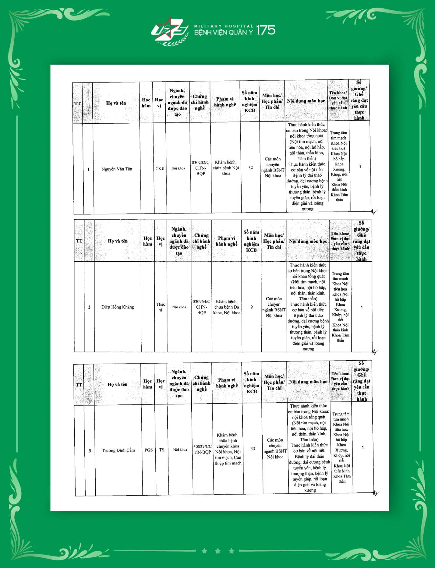 Phụ lục 2: Danh sách Giảng viên / Khoa / Giường / Đáp ứng yêu cầu giảng dạy thực hành tại Bệnh viện Quân y 175