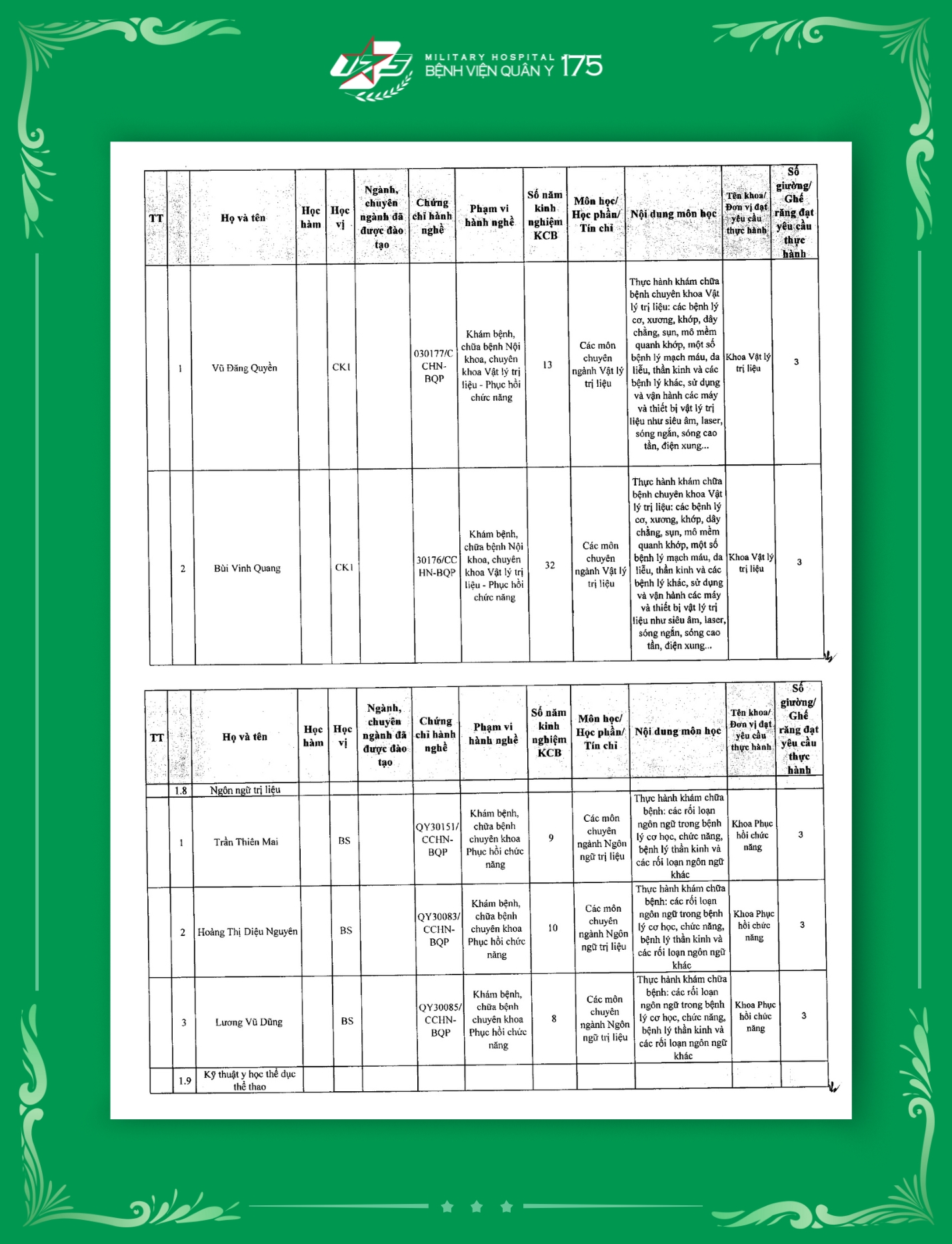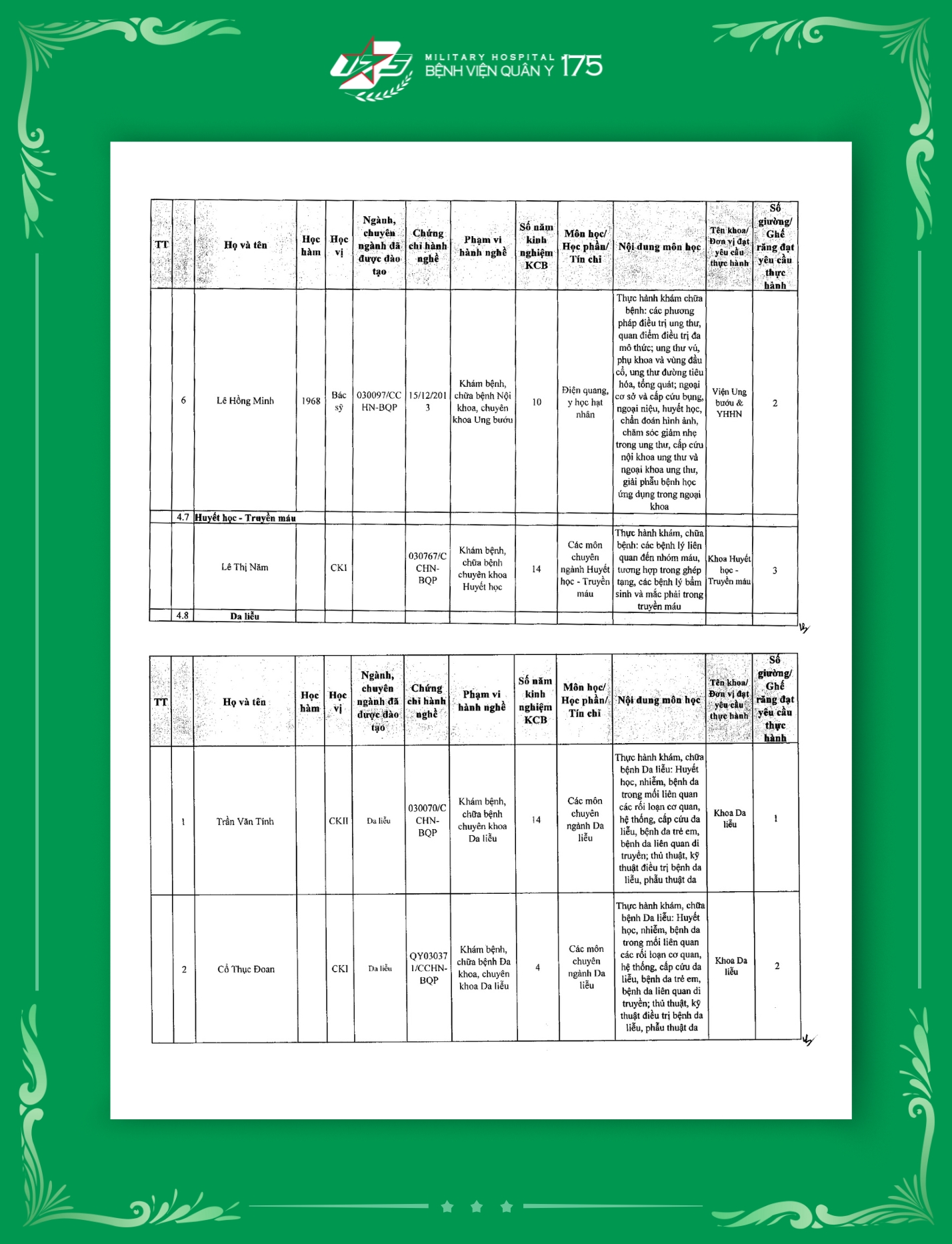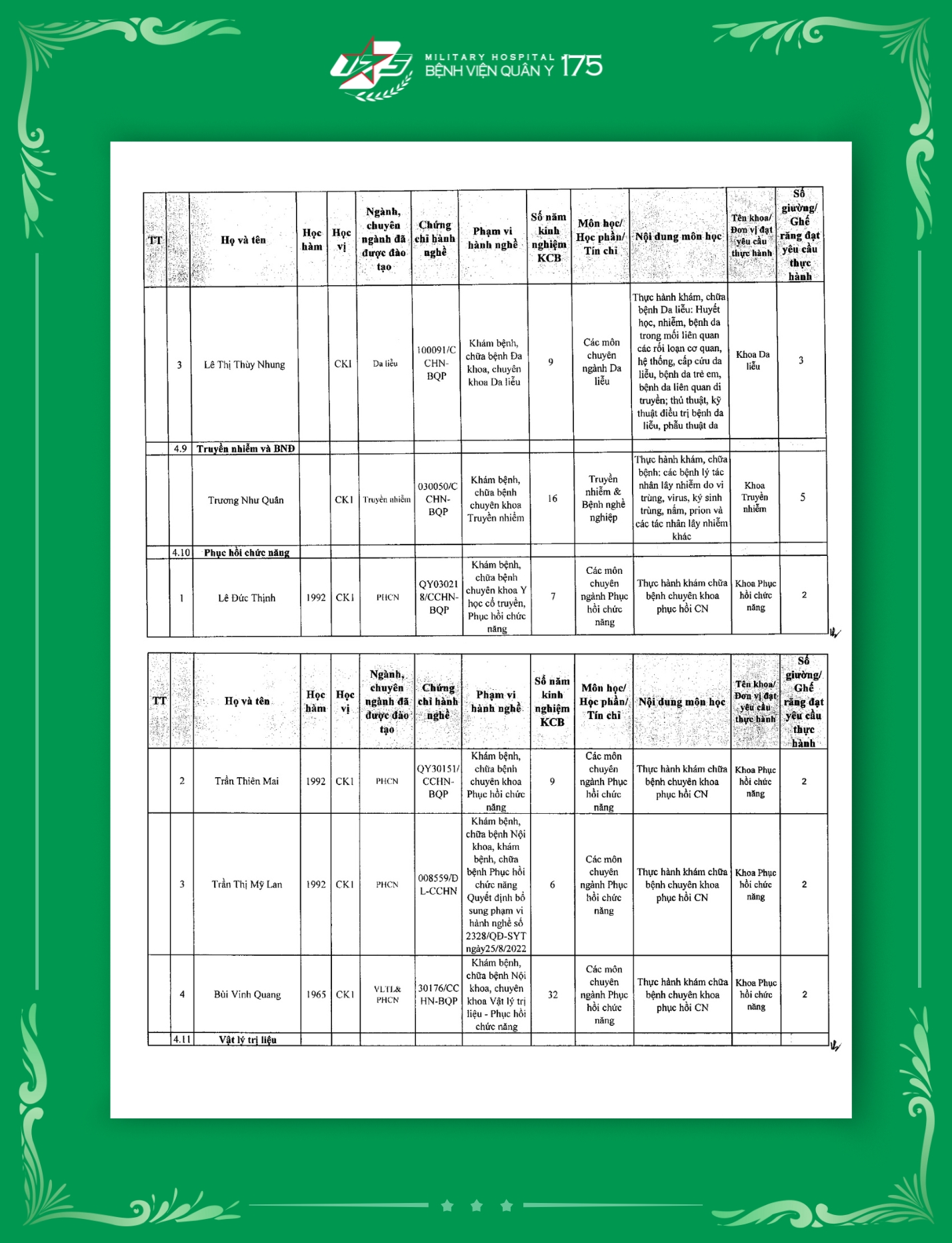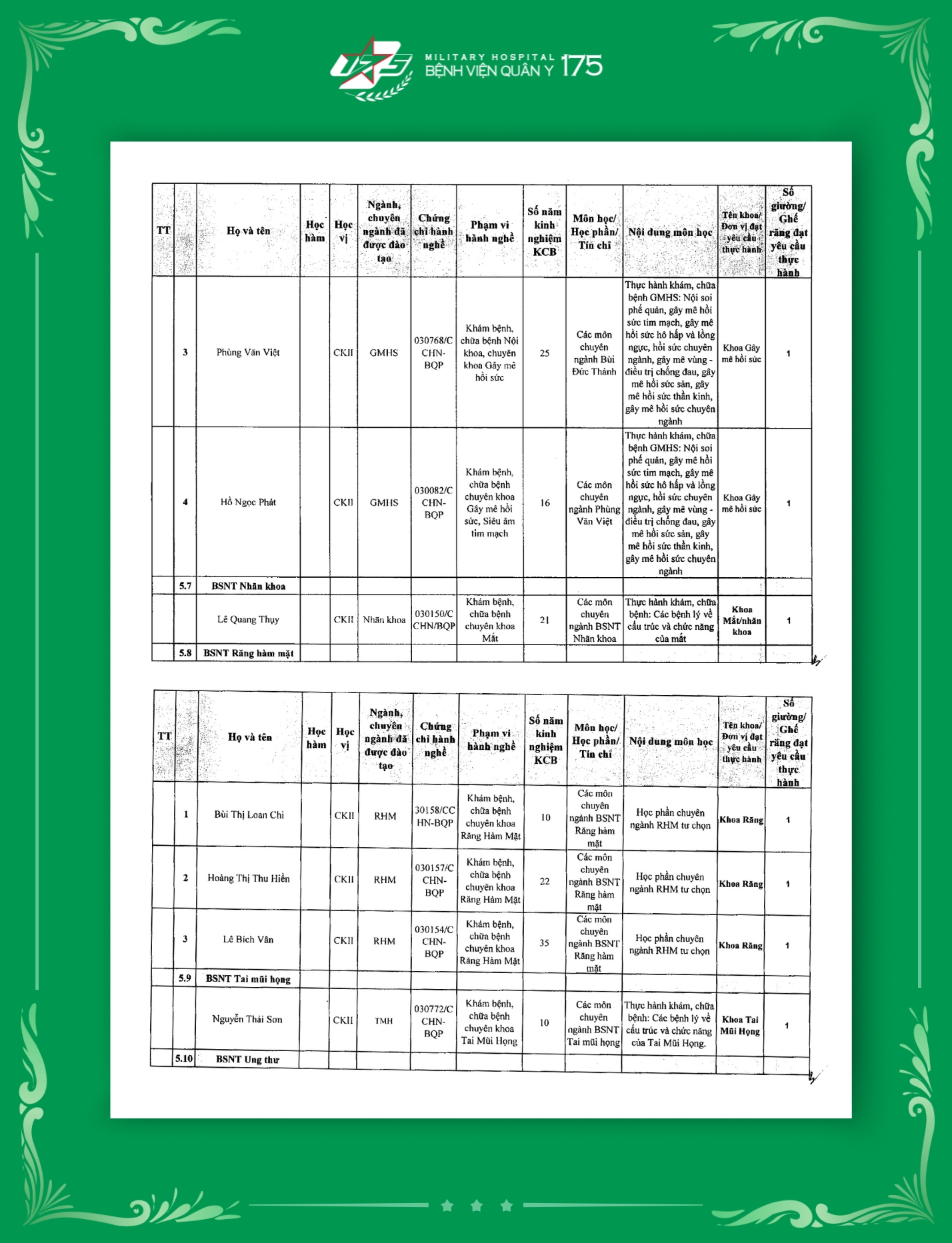 Phụ lục 2: Danh sách Giảng viên / Khoa / Giường / Đáp ứng yêu cầu giảng dạy thực hành tại Bệnh viện Quân y 175