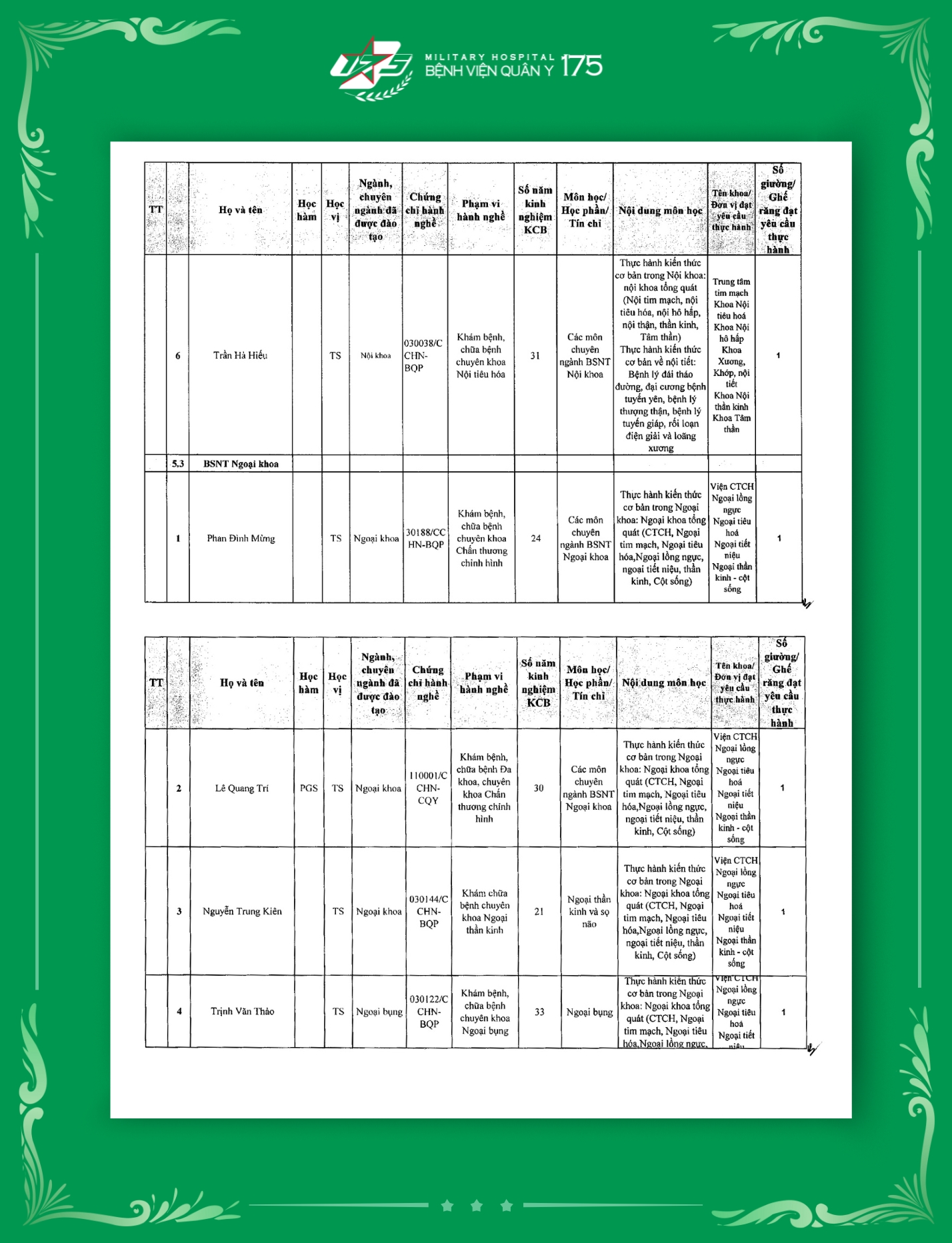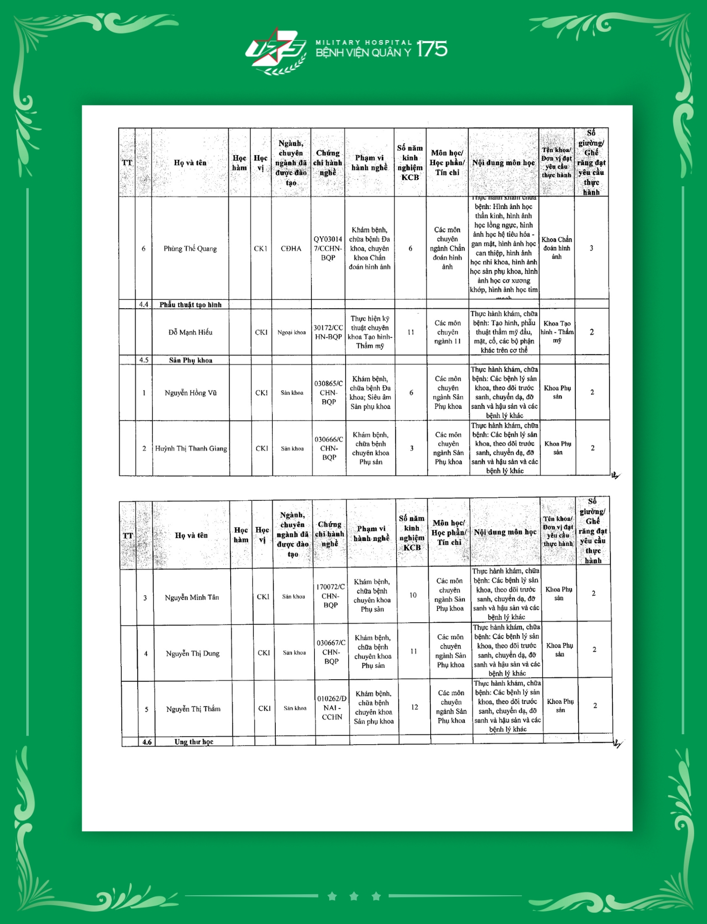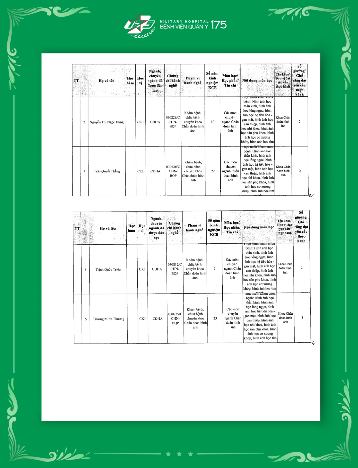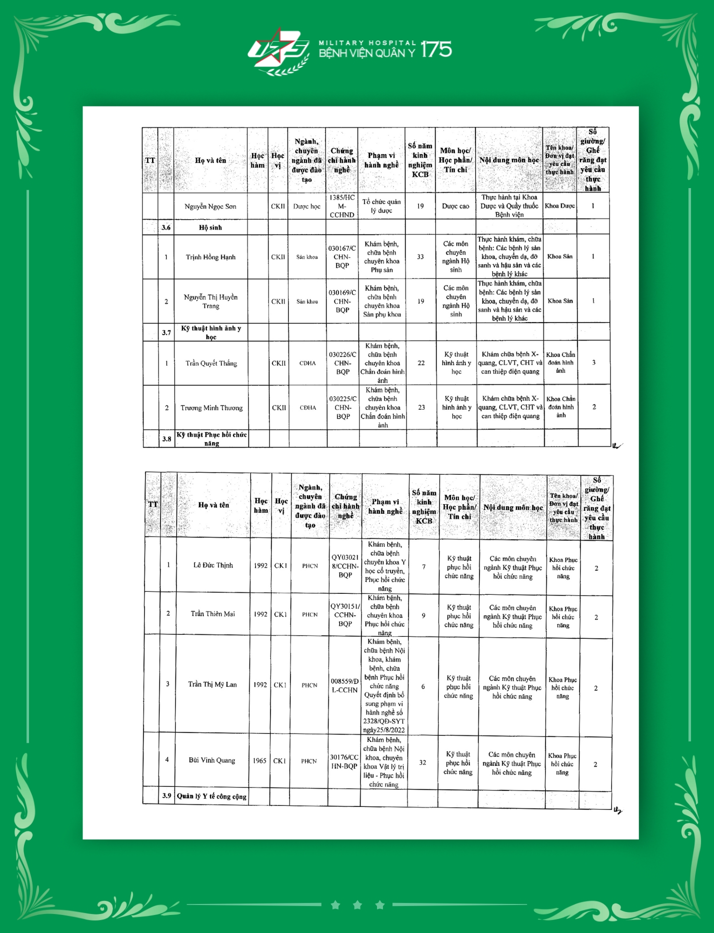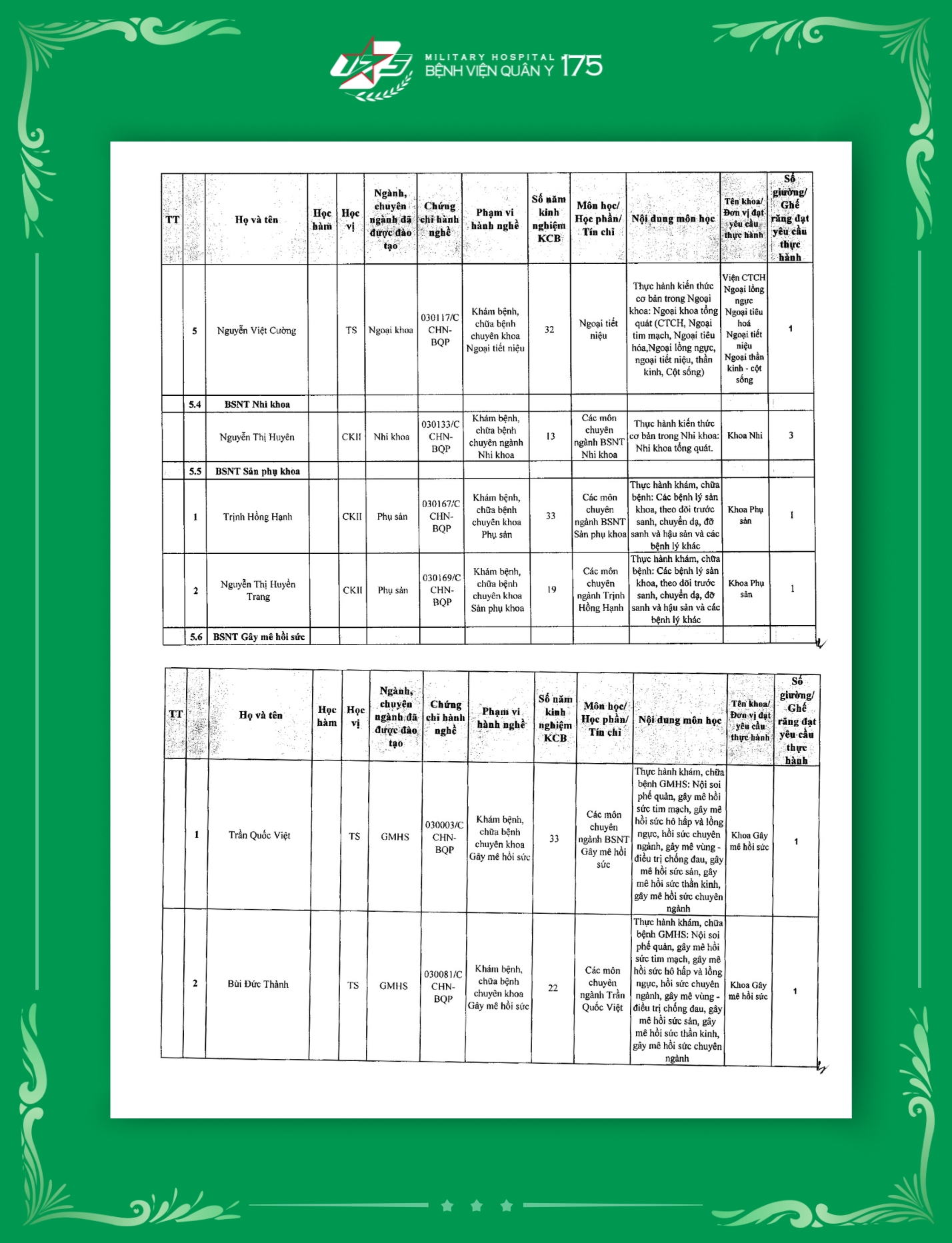 Phụ lục 2: Danh sách Giảng viên / Khoa / Giường / Đáp ứng yêu cầu giảng dạy thực hành tại Bệnh viện Quân y 175