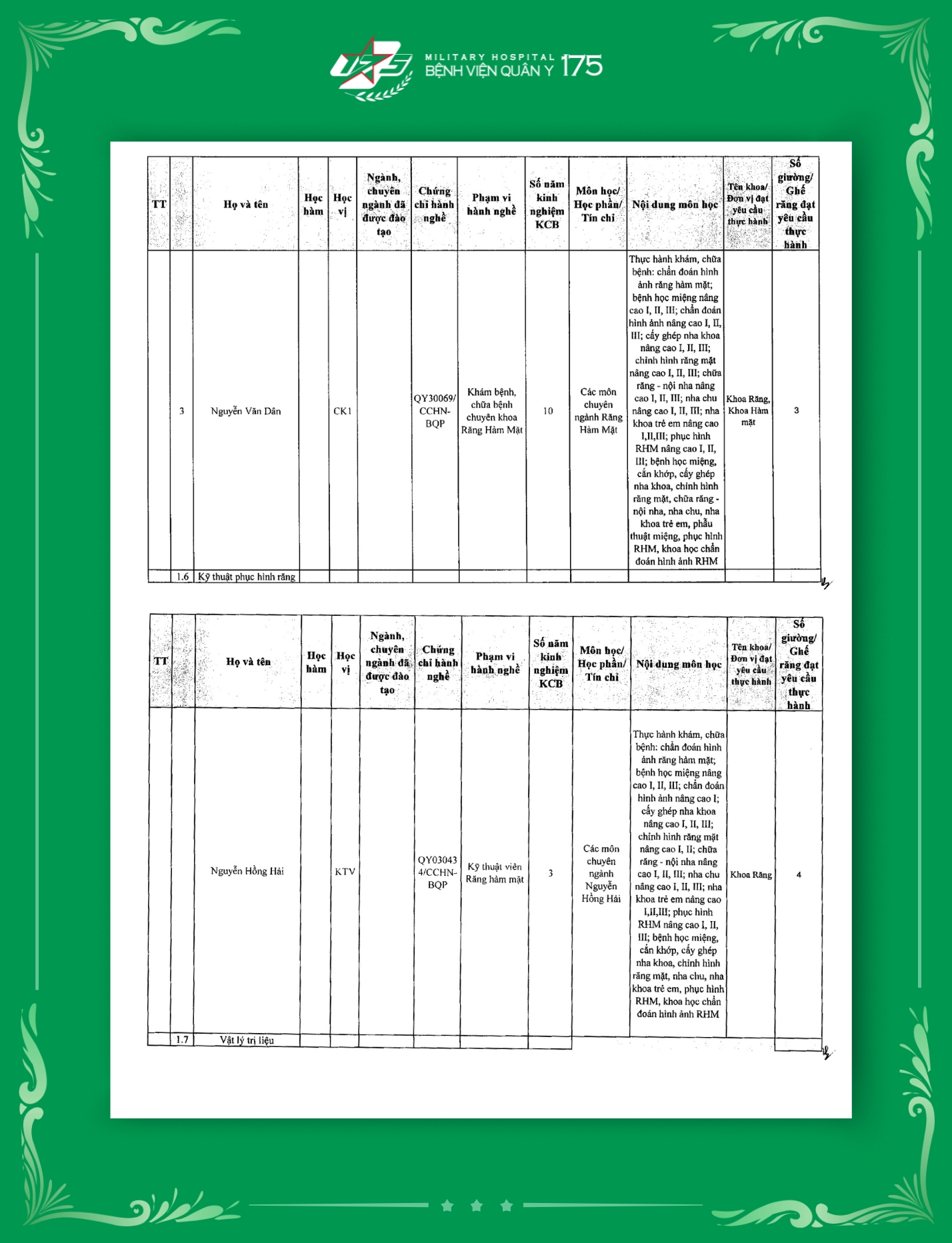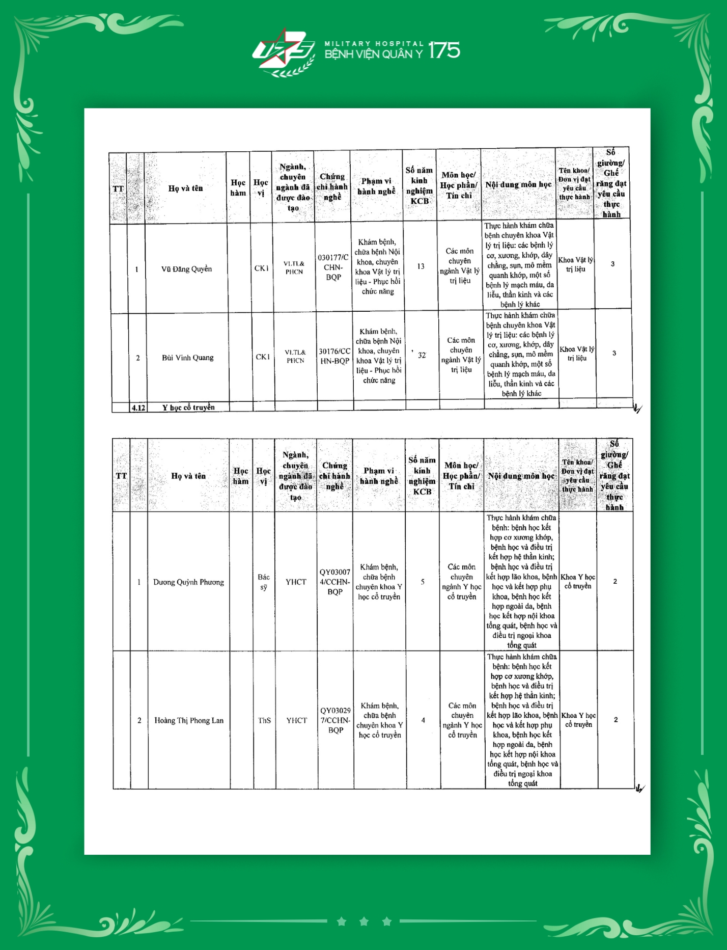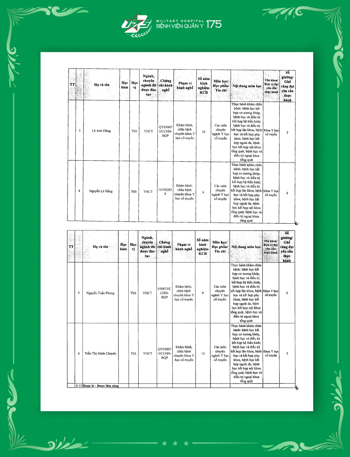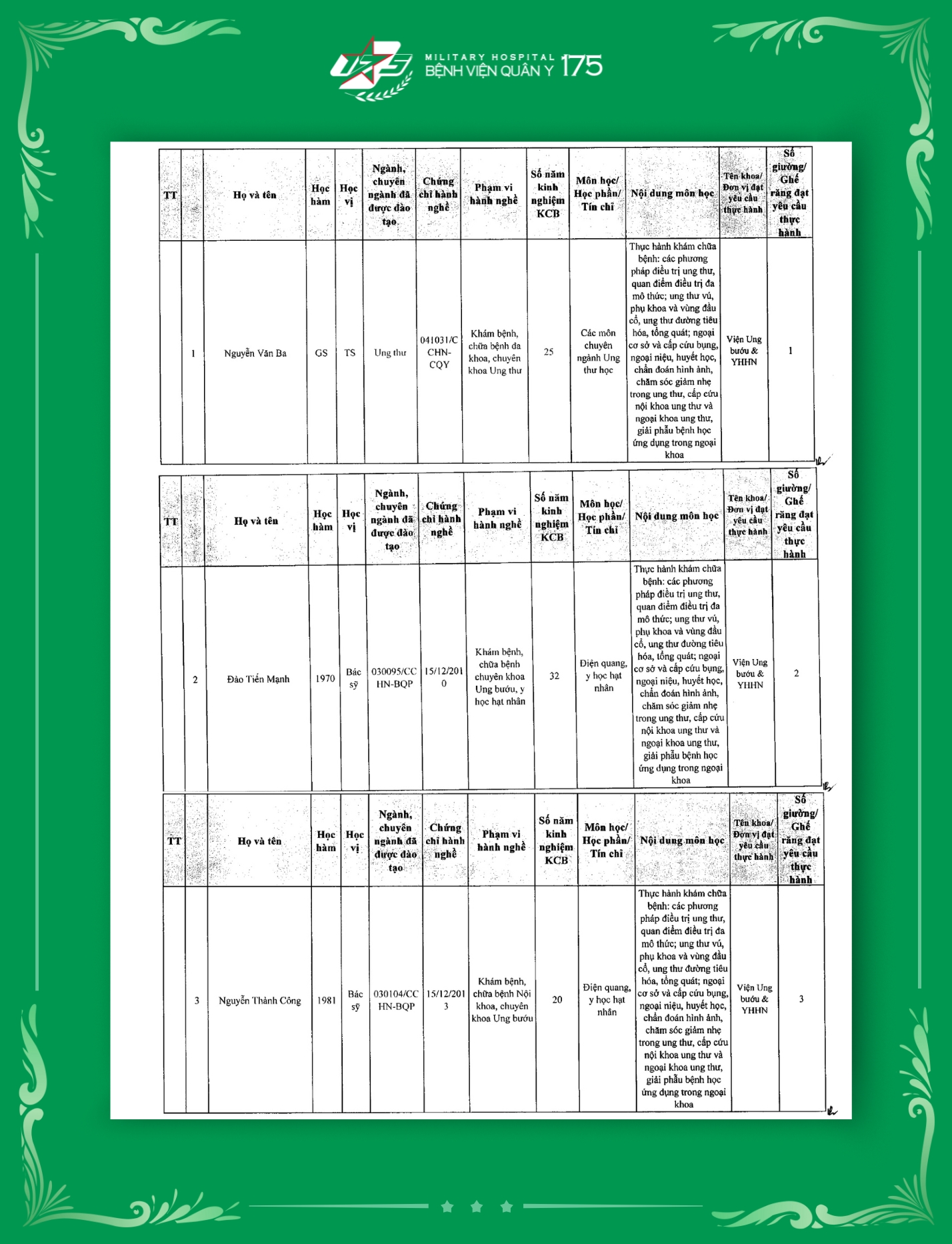 Phụ lục 2: Danh sách Giảng viên / Khoa / Giường / Đáp ứng yêu cầu giảng dạy thực hành tại Bệnh viện Quân y 175
