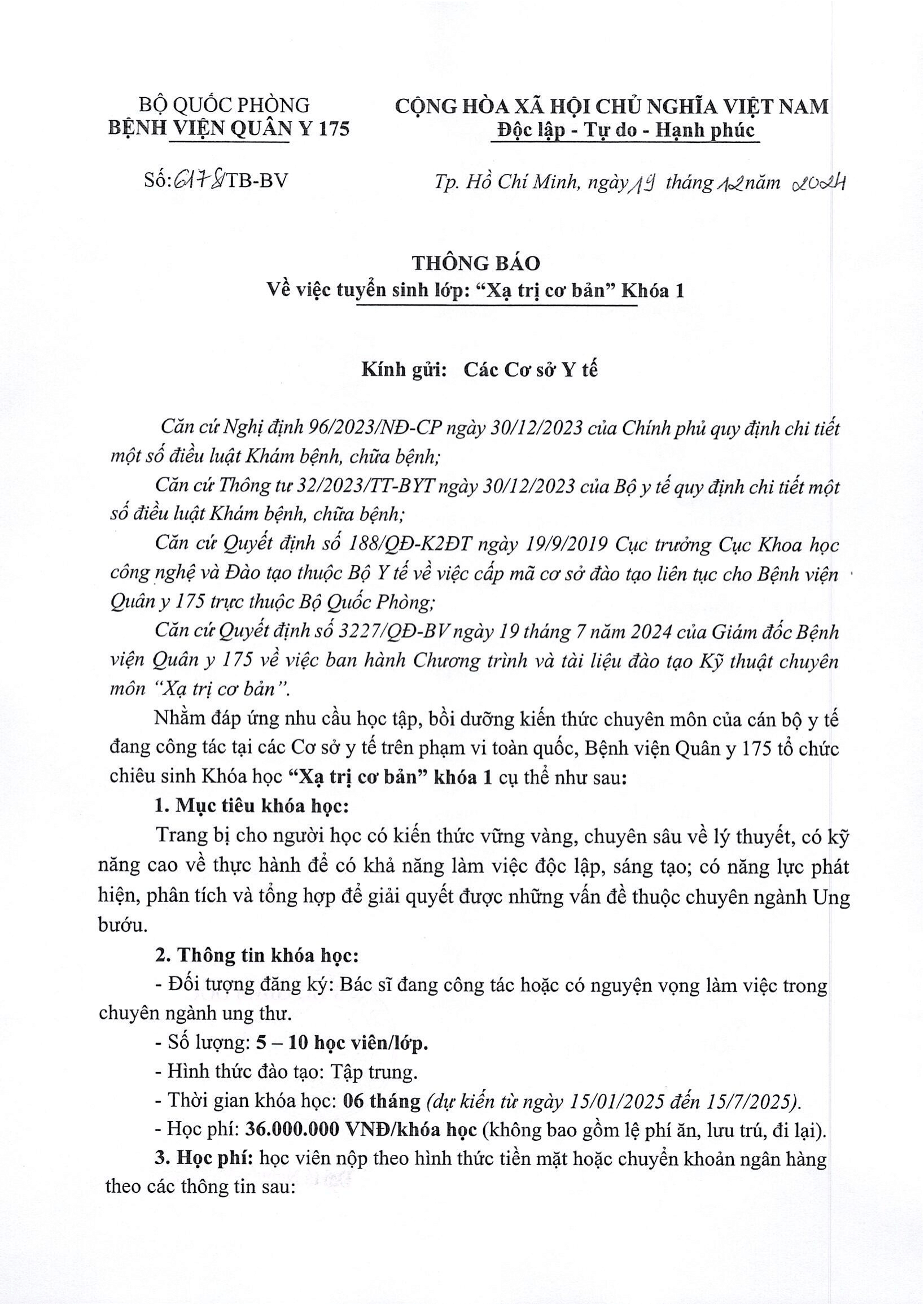Nhằm đáp ứng nhu cầu học tập, bồi dưỡng kiến thức chuyên môn của cán bộ y tế đang công tác tại các cơ sở y tế trong và ngoài quân đội, Bệnh viện Quân y 175 tổ chức chiêu sinh Khóa học “Xạ trị cơ bản” Khóa 01.