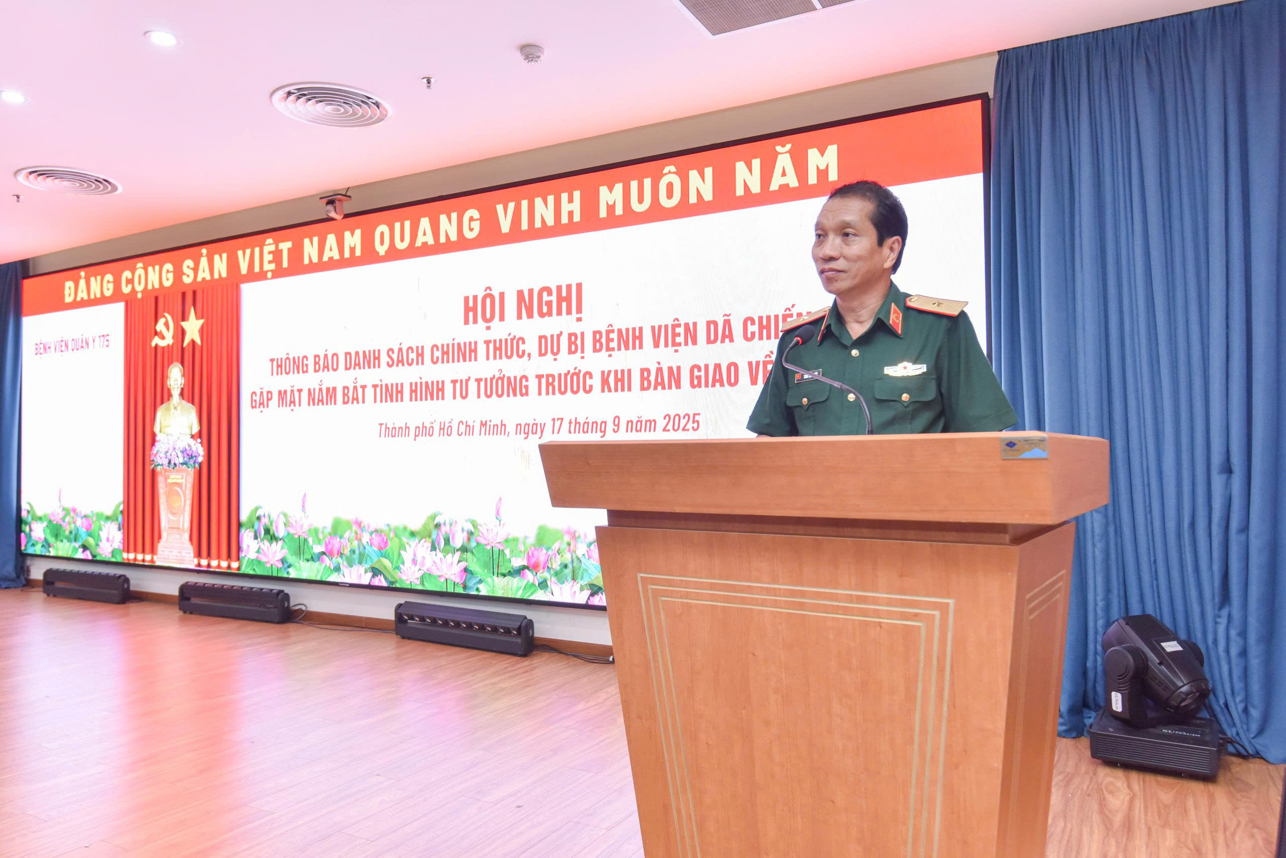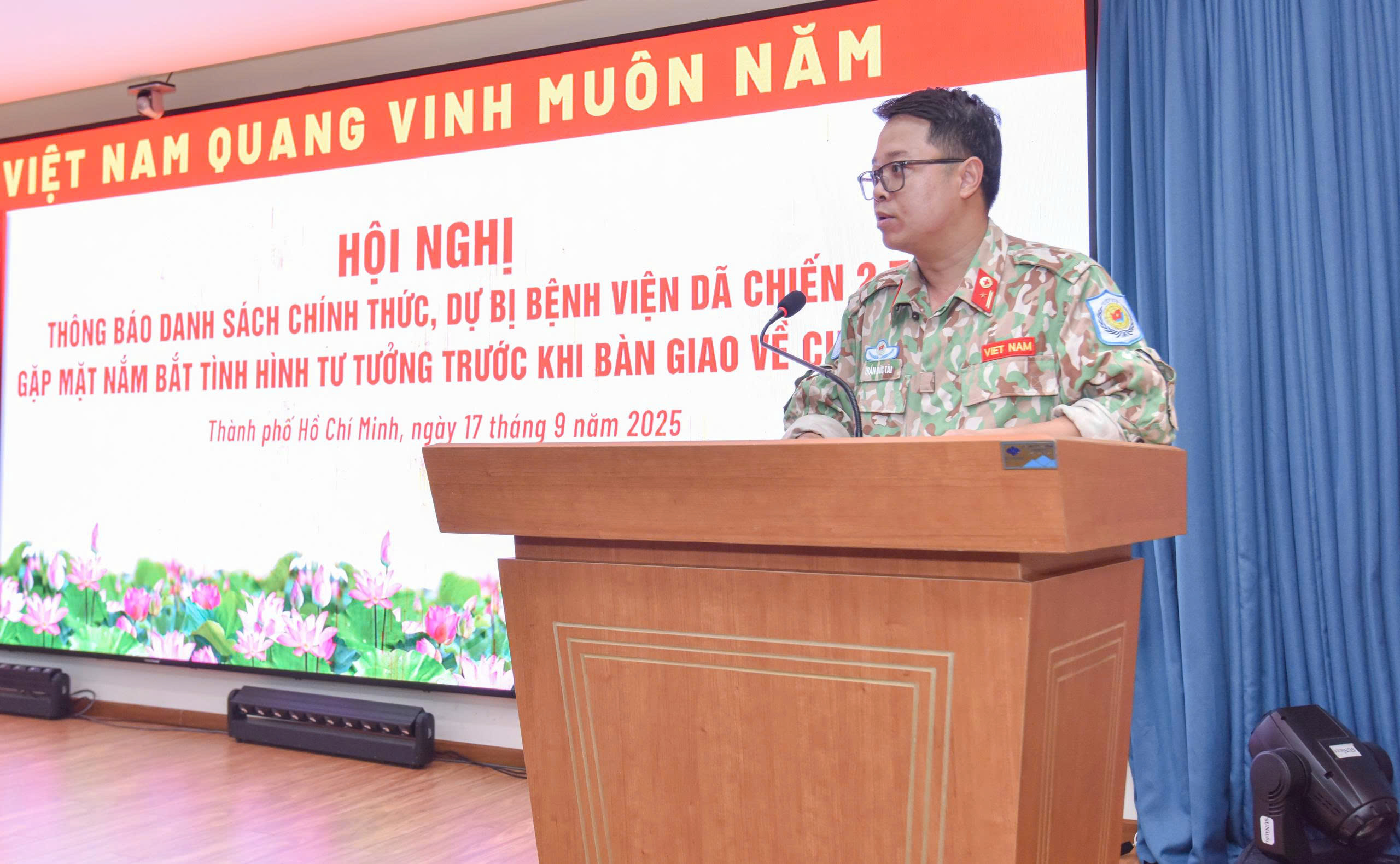 Chiều 17/9, tại hội trường Viện Chấn thương chỉnh hình, Bệnh viện Quân y 175 tổ chức thông báo Quyết định Bộ Quốc phòng về nhân sự chính thức và dự bị Bệnh viện dã chiến cấp 2 số 7 (BVDC 2.7) tham gia Lực lượng Gìn giữ hòa bình của Liên Hợp quốc tại Nam Sudan. Hội nghị do Thiếu tướng Trần Quốc Việt – Giám đốc Bệnh viện Quân y 175 chủ trì, cùng sự tham dự của chỉ huy các đơn vị và toàn thể cán bộ, nhân viên BVDC 2.7.