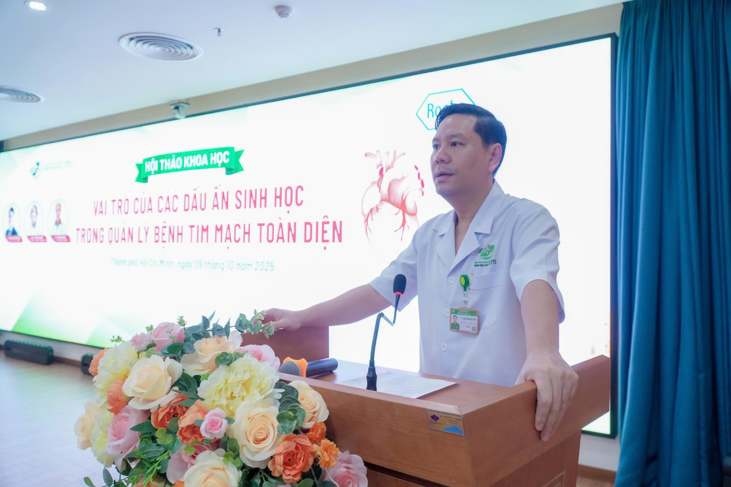 Phát biểu khai mạc, Thượng tá, TS. BS Đào Đức Tiến, Phó Giám đốc Bệnh viện Quân y 175 nhấn mạnh: Bệnh lý tim mạch hiện là nguyên nhân hàng đầu gây tử vong trên toàn cầu. Việc chẩn đoán sớm, xác định chính xác các yếu tố nguy cơ và lựa chọn hướng điều trị phù hợp có ý nghĩa đặc biệt quan trọng trong cải thiện tiên lượng người bệnh. Trong xu thế y học hiện đại, các dấu ấn sinh học (biomarker) không chỉ hỗ trợ chẩn đoán sớm mà còn giúp bác sĩ phát hiện sớm các trường hợp nguy cơ cao, đưa ra phác đồ điều trị cụ thể, từ đó nâng cao hiệu quả điều trị và chất lượng chăm sóc người bệnh.