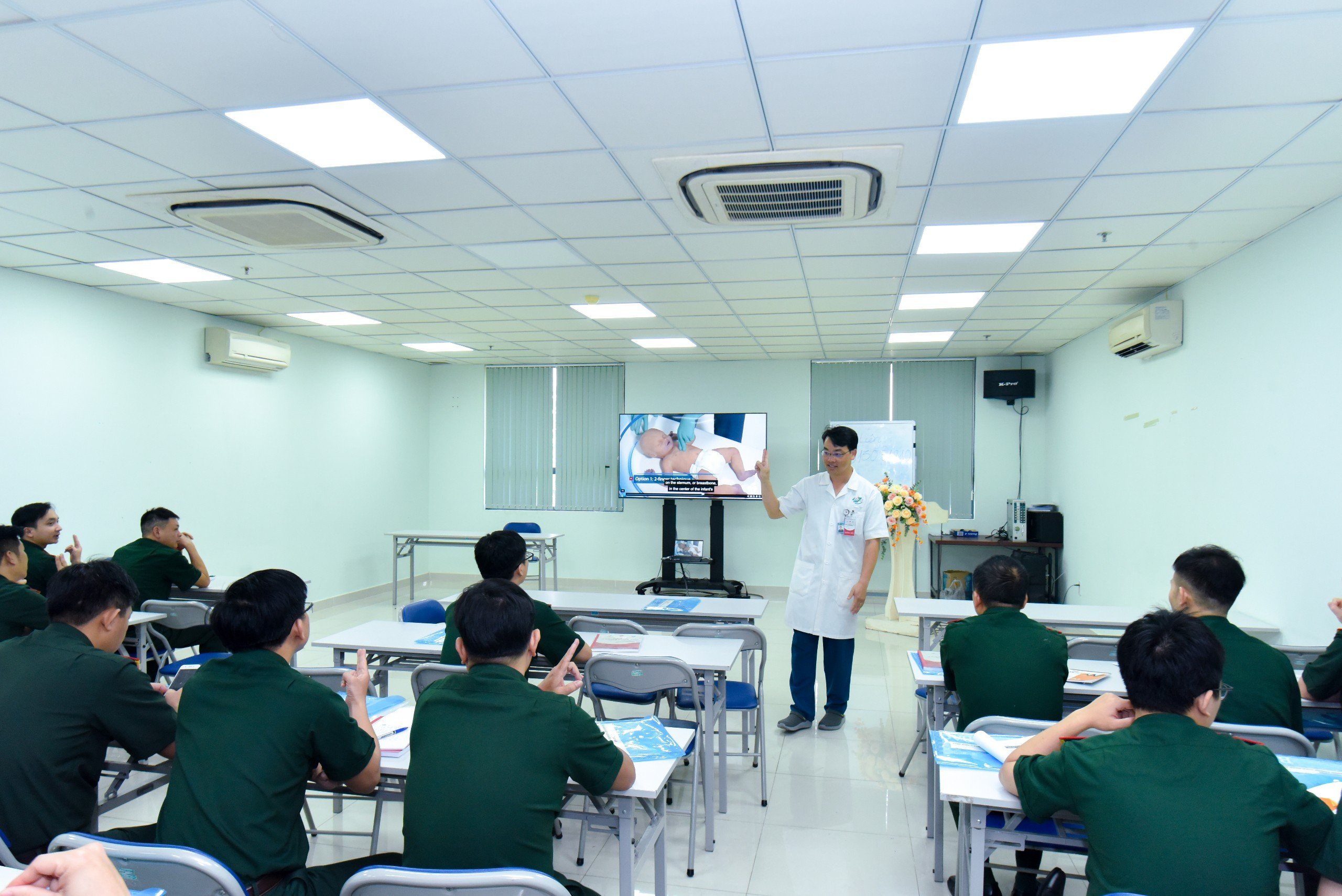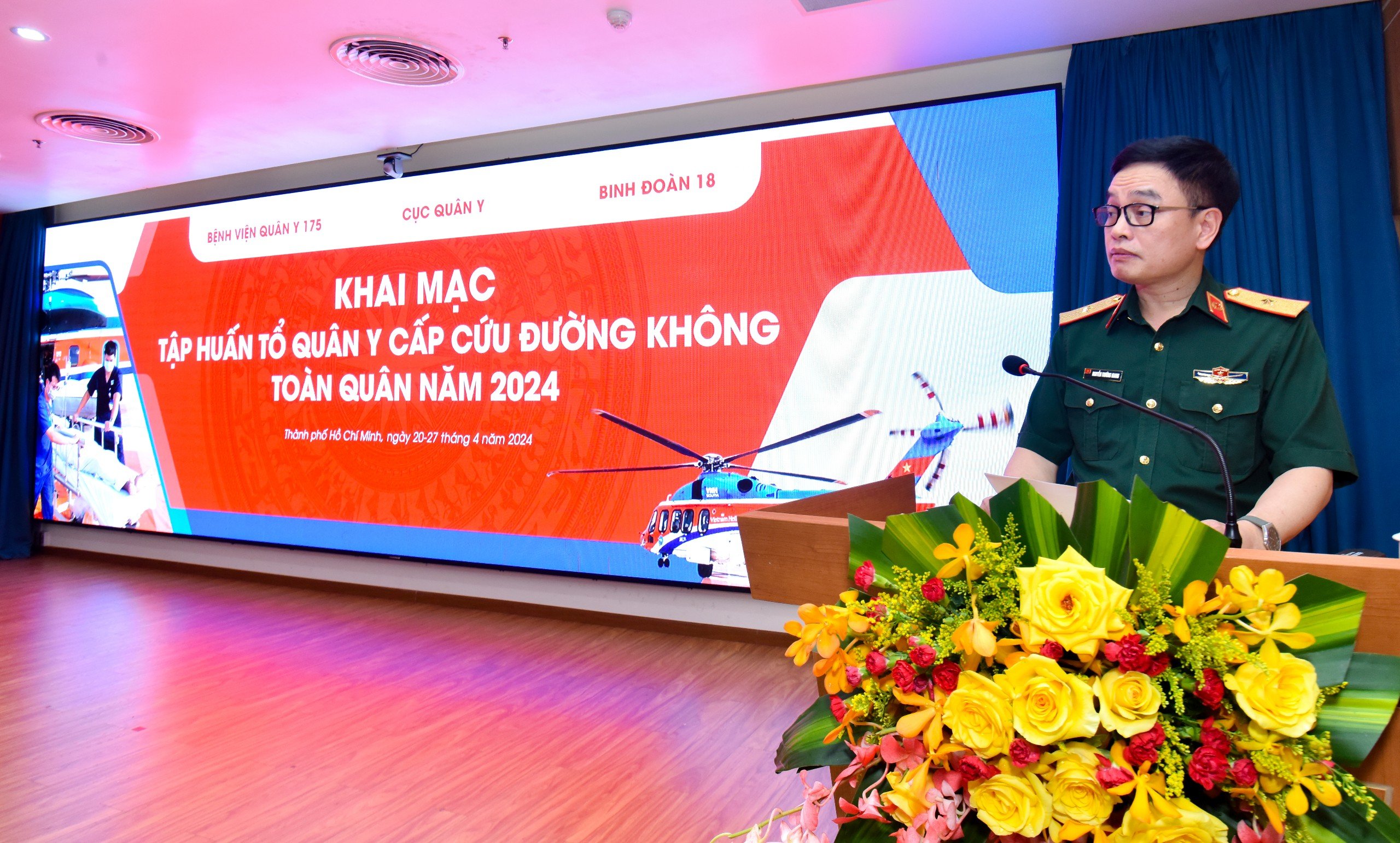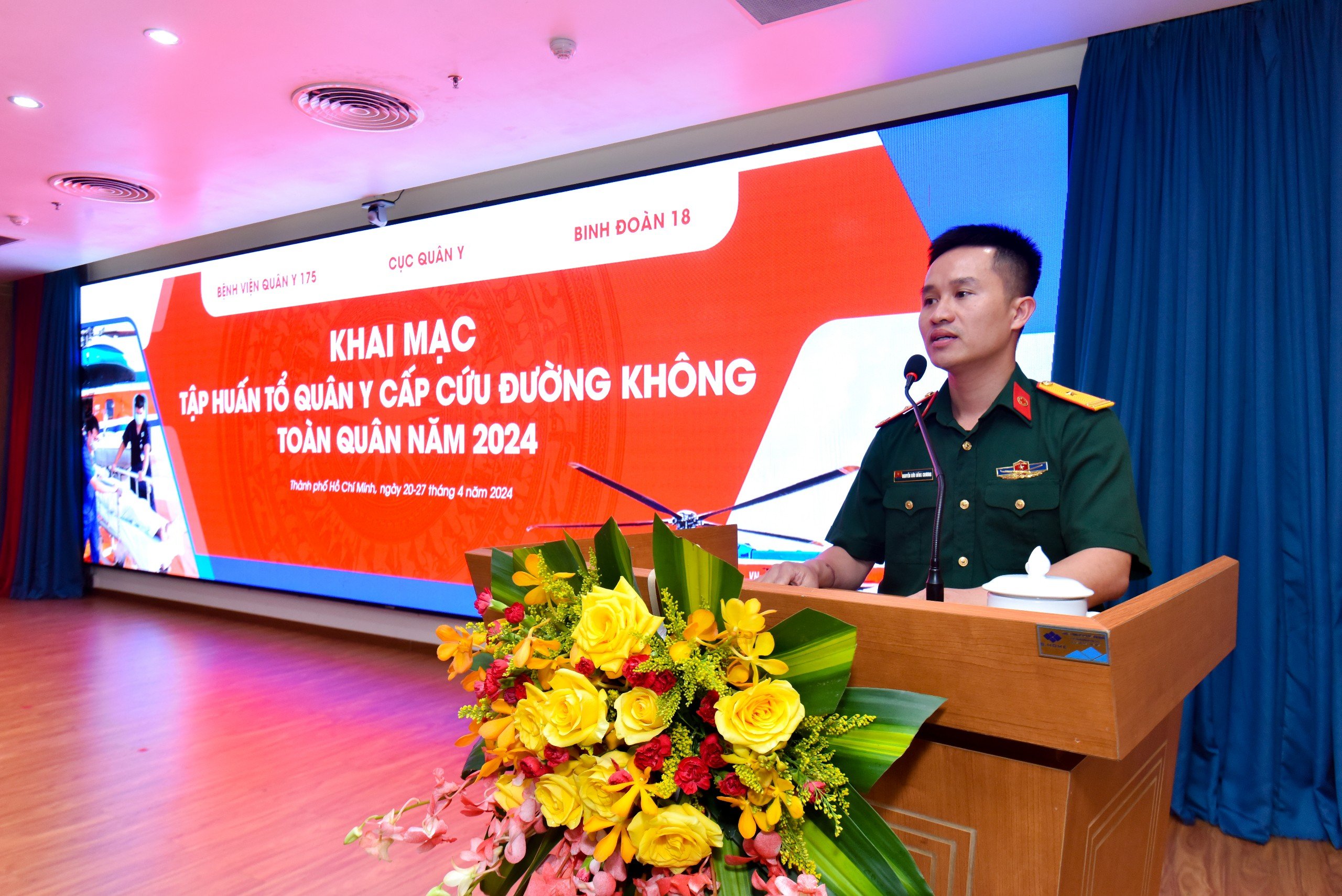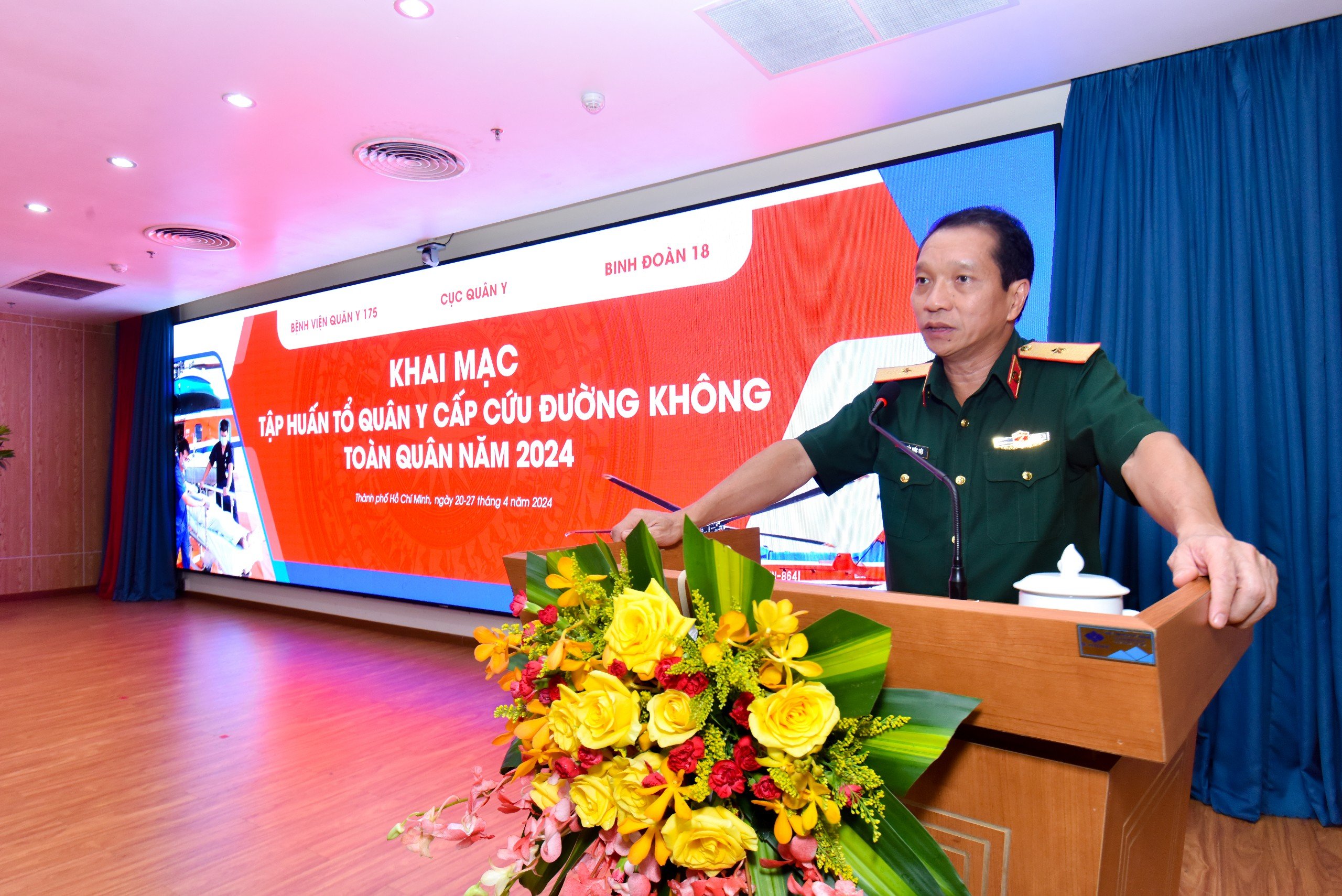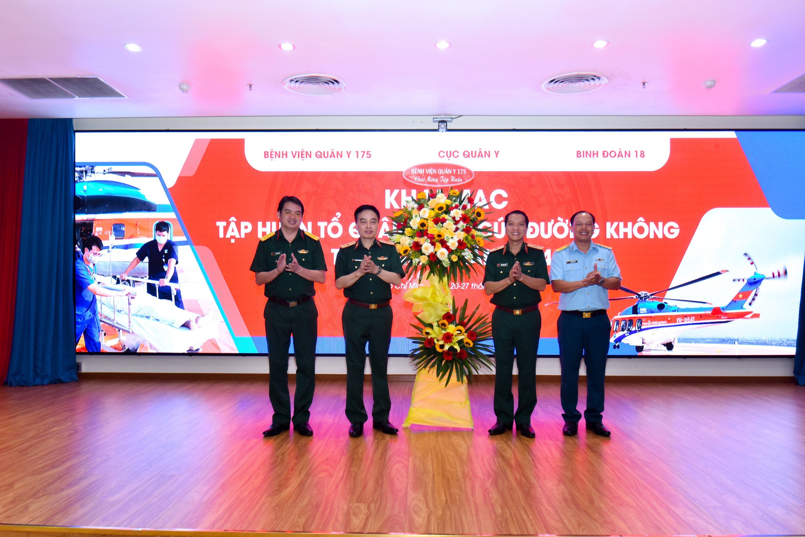 Phát biểu tại Lễ khai mạc, Thiếu tướng, TS.BS Trần Quốc Việt – Giám đốc Bệnh viện Quân y 175 chia sẻ: “Với vai trò là Bệnh viện tuyến cuối phía Nam của Quân đội, Bệnh viện Quân y 175 hiểu rõ vai trò, trách nhiệm của mình trong việc tiên phong triển khai những mô hình mới, chuyên môn và chuyên nghiệp hoá những kỹ thuật cao trong chẩn đoán, điều trị, chăm sóc bệnh nhân. Lớp Tập huấn Tổ quân y cấp cứu đường không năm nay do Cục Quân y phối hợp với Bệnh viện Quân y 175 tổ chức với 03 nội dung đào tạo: Hồi sinh tim phổi (BLS) theo tiêu chuẩn AHA, Cấp cứu Chấn thương Quốc tế (ITLS) và Cấp cứu đường không, với mong muốn trang bị cho học viên một cái nhìn tổng quát, kiến thức và kỹ năng trong việc thực hiện cấp cứu, vận chuyển bệnh nhân bằng đường hàng không. Chúng tôi rất tự hào khi đội ngũ giảng viên của Lớp Tập huấn Tổ quân y Cấp cứu đường không là cán bộ, nhân viên của Bệnh viện trưởng thành từ việc tham gia các Bệnh viện Dã chiến Gìn giữ hoà bình Liên Hợp Quốc, các khoá huấn luyện Cấp cứu đường không trong nước và quốc tế trong những năm vừa qua”.