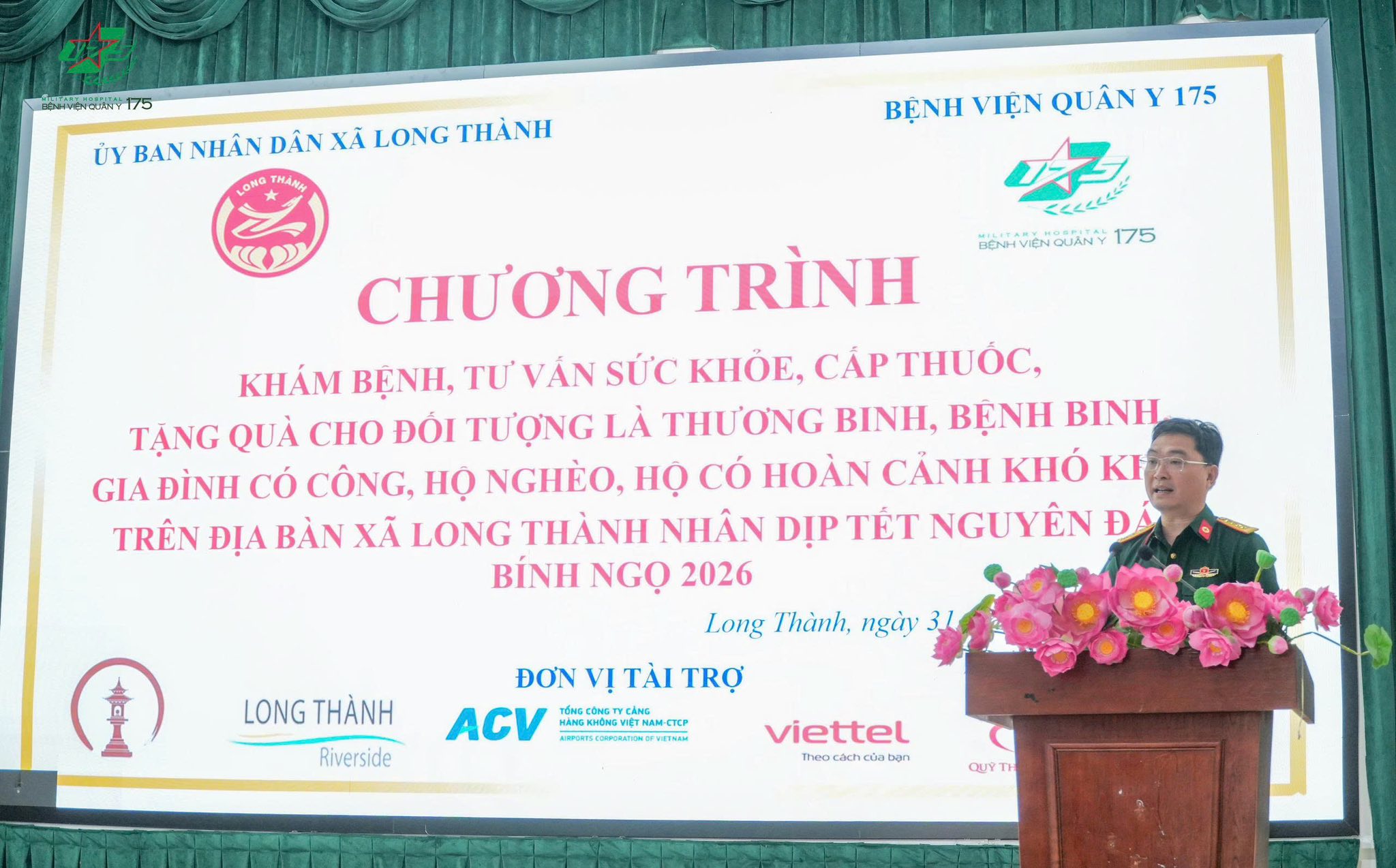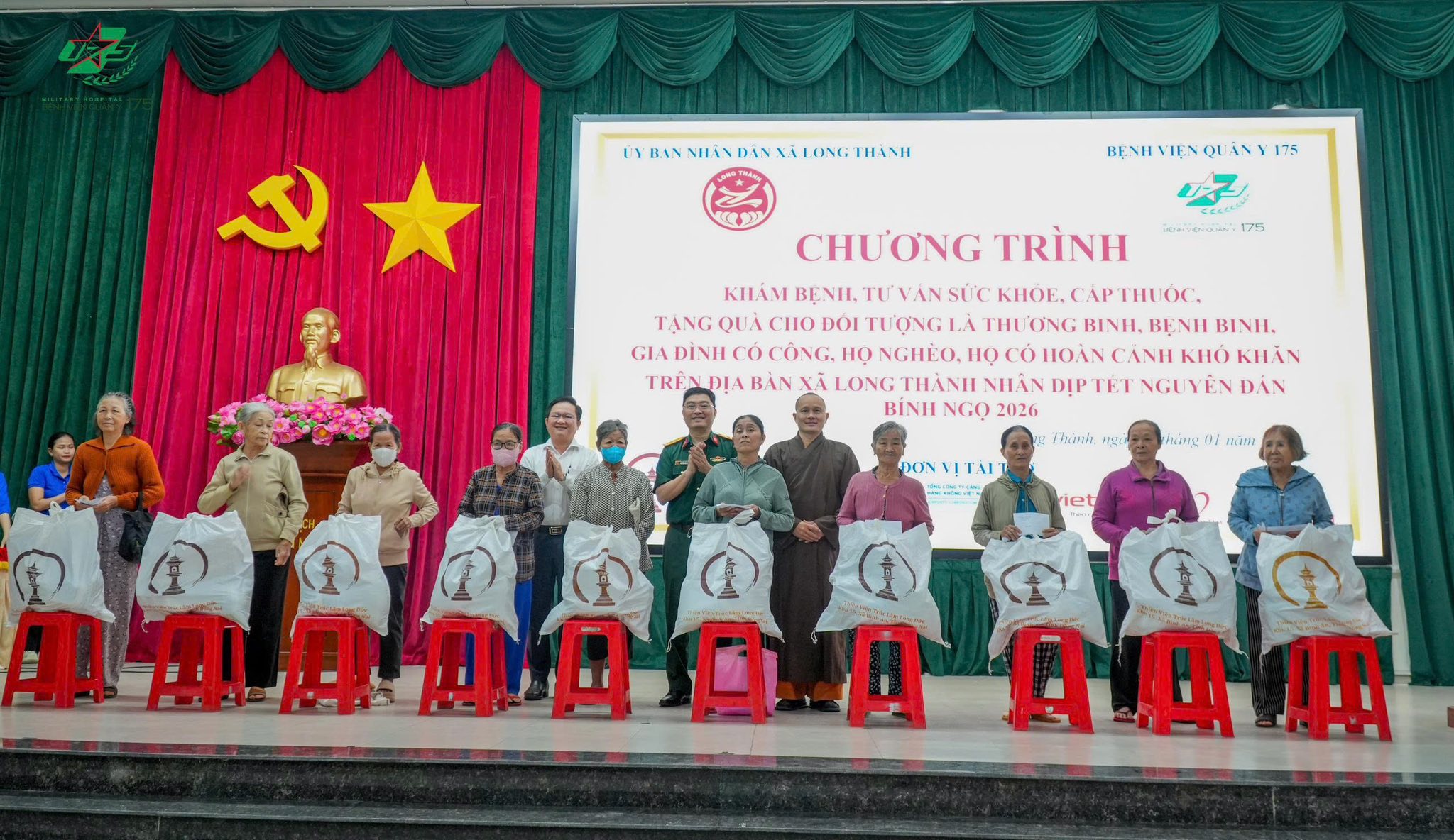 Sáng ngày 31/1, Bệnh viện Quân y 175 đã phối hợp với UBND xã Long Thành tổ chức chương trình khám bệnh, tư vấn sức khỏe, cấp thuốc và tặng quà Tết cho thương binh, bệnh binh, gia đình có công với cách mạng, hộ nghèo tại xã Long Thành, Đồng Nai. Chương trình nhằm nâng cao sức khỏe cho Nhân dân trên địa bàn, đặc biệt là công tác chăm sóc sức khỏe cho các đối tượng là thương binh, bệnh binh, gia đình chính sách, người có công, hộ nghèo, hộ có hoàn cảnh khó khăn.