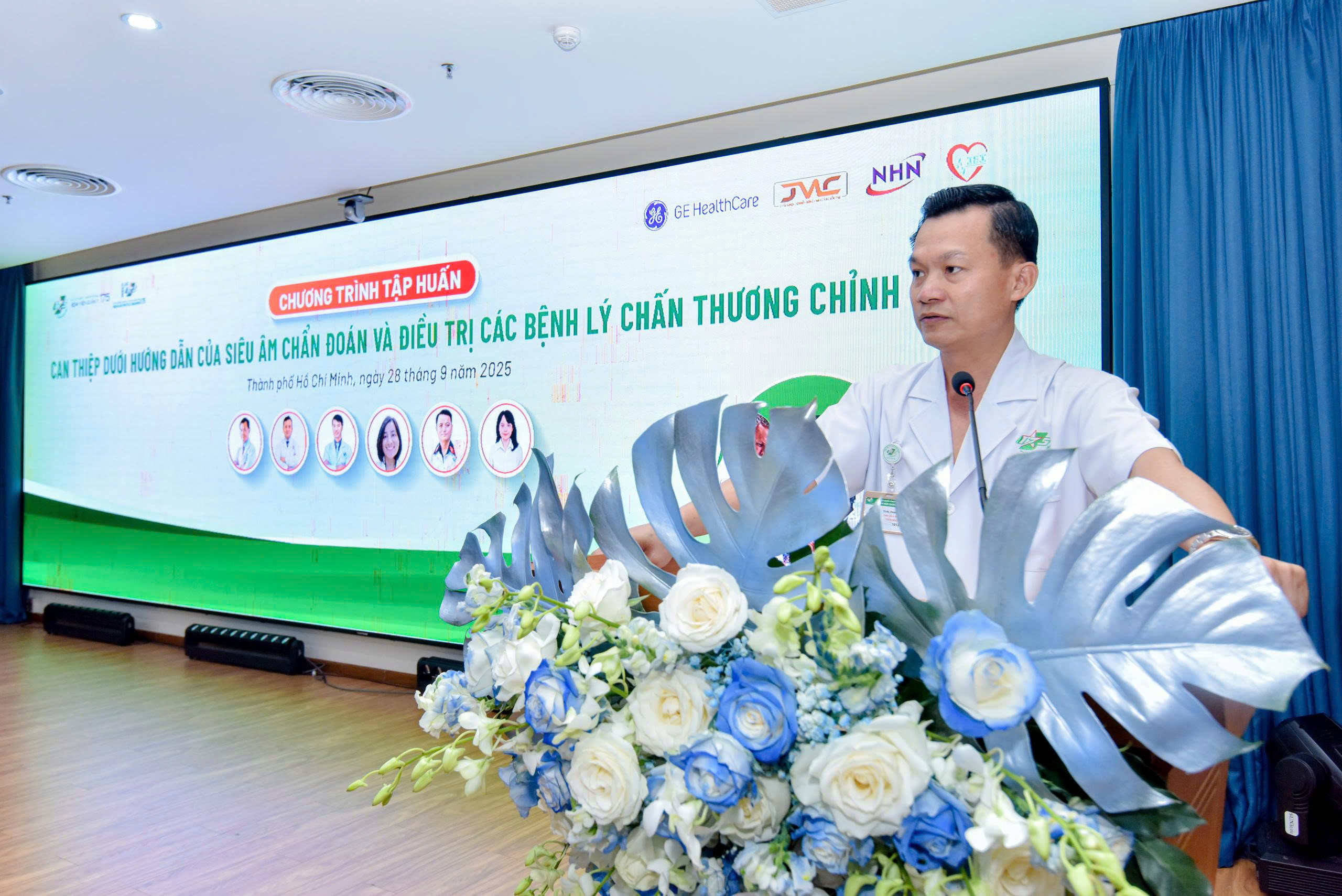 Chủ trì hội thảo có Đại tá, TS. BS. Phan Đình Mừng – Phó Giám đốc Bệnh viện Quân y 175, Giám đốc Viện Chấn thương Chỉnh hình. Các giảng viên tham gia giảng dạy là các chuyên gia đầu ngành, gồm: Đại tá, TS. BS. Phan Đình Mừng – Phó Giám đốc Bệnh viện Quân y 175, Giám đốc Viện Chấn thương Chỉnh hình; BS CKII Phạm Thế Hiển – Bệnh viện Nguyễn Tri Phương, Tổng Thư ký Hội Nội soi cơ xương khớp TP. Hồ Chí Minh; BS CKII Bùi Văn Phúc – Phó Chủ nhiệm Khoa Chi trên, Viện CTCH, BVQY 175; BS CKII Hồ Thị Lê – Phụ trách Đơn vị Nội cơ xương khớp, Viện CTCH, BVQY 175; BS CKI Hoàng Xuân Trường – Phụ trách Đơn vị Chẩn đoán hình ảnh, Viện CTCH, BVQY 175; và BS CKI Trầm Hoàng Mỹ Phương – Khoa Chẩn đoán hình ảnh, BVQY 175. Chương trình thu hút gần 150 học viên là bác sĩ, điều dưỡng, kỹ thuật viên đến từ nhiều Bệnh viện trong và ngoài quân đội