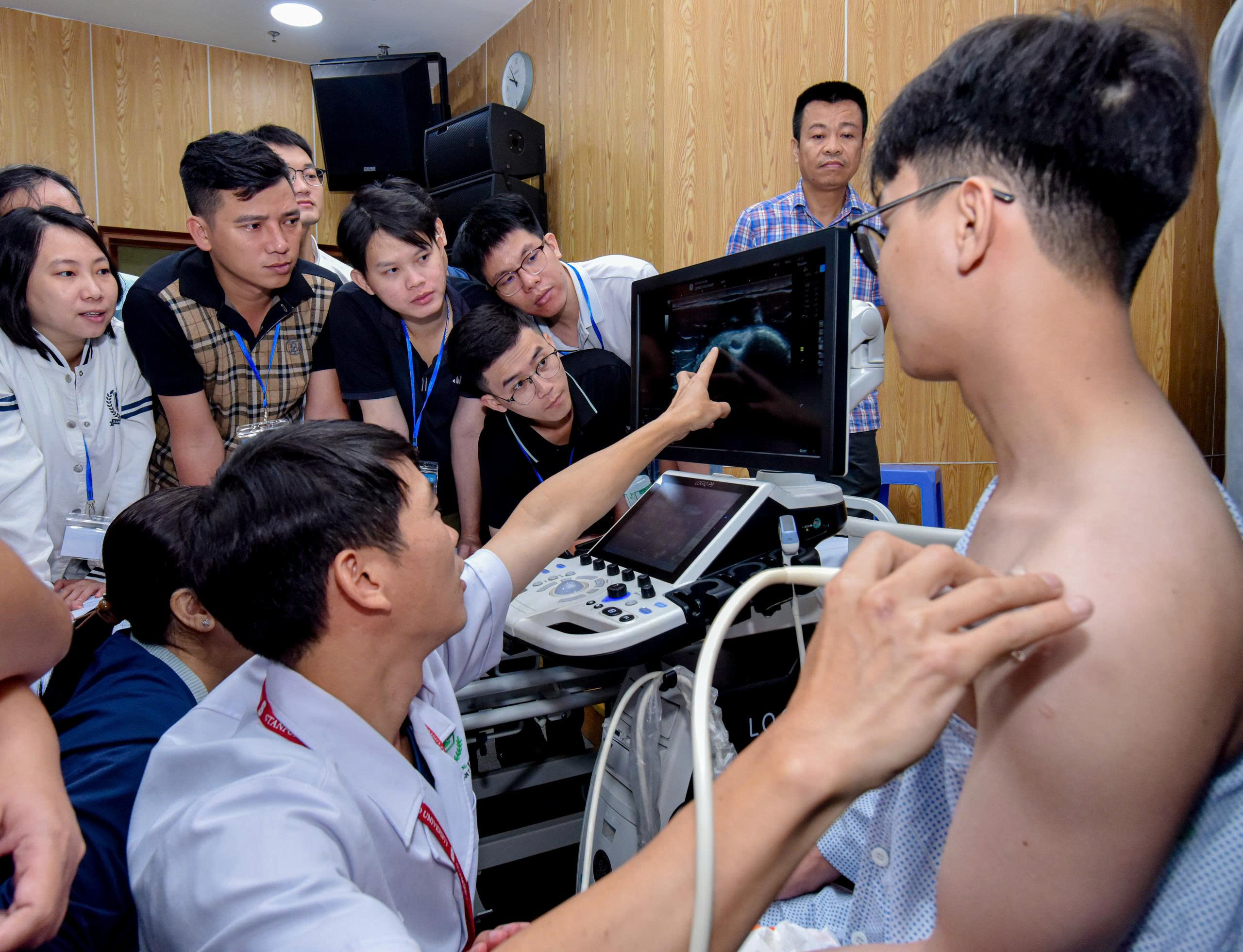 Đáng chú ý, phần lớn thời lượng được dành cho thực hành. Với 06 máy siêu âm hiện đại tại 05 trạm hướng dẫn, học viên được luyện kỹ năng “lái kim” trên mô hình Agar và quan sát trực tiếp các thao tác can thiệp trên người bệnh. Giảng viên trực tiếp hướng dẫn, chỉnh sửa kỹ thuật và giải đáp thắc mắc, giúp học viên củng cố kỹ năng, nâng cao sự chính xác và tự tin khi áp dụng vào thực tiễn lâm sàng. Các phiên thảo luận tập trung vào xử trí những bệnh lý thường gặp như rách gân cơ chóp xoay, hội chứng ống cổ tay, viêm điểm bám gân lồi cầu ngoài (Tennis Elbow), thoái hóa khớp gối, rách sụn chêm. Qua đó, học viên mở rộng góc nhìn lâm sàng, lựa chọn phương án điều trị tối ưu, ưu tiên bảo tồn, hạn chế phẫu thuật không cần thiết.
