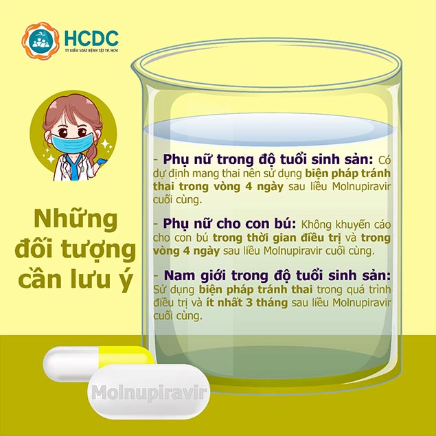 – Nam giới trong độ tuổi sinh sản: Sử dụng biện pháp tránh thai trong quá trình điều trị và ít nhất 3 tháng sau liều Molnupiravir cuối cùng.