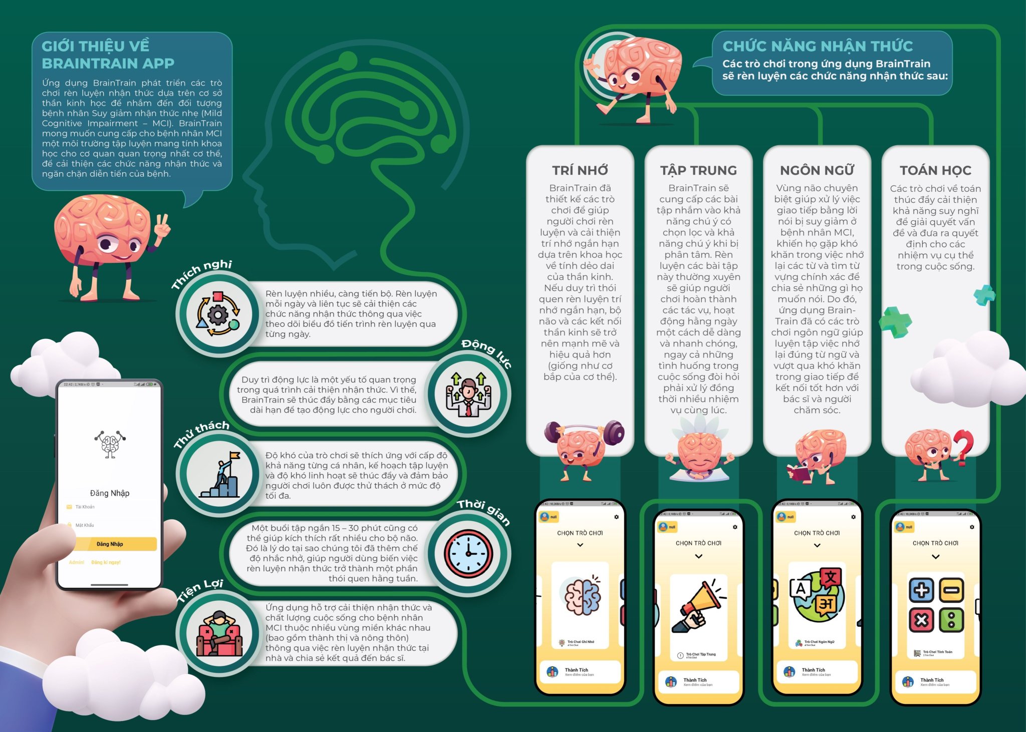 Đây là chương trình được phát triển dựa trên các trò chơi rèn luyện não bộ trên cơ sở thần kinh học nhằm hướng đến những đối tượng trên, với mong muốn cung cấp một môi trường tập luyện mang tính khoa học, cải thiện các chức năng nhận thức và ngăn chặn diễn tiến của bệnh. Cụ thể, ứng dụng BrainTrain sẽ nhắm đến 4 lĩnh vực: Trí nhớ, Tập trung, Ngôn ngữ và Toán học, với bốn trò chơi cho mỗi lĩnh vực. Độ khó sẽ được điều chỉnh theo mức độ nhận thức của từng bệnh nhân, đảm bảo nhiệm vụ luôn mang tính thử thách.