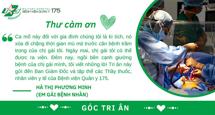 Và thật kì diệu, nhờ bàn tay vàng cùng tấm lòng tận tâm của Tiến sĩ, Bác sĩ Nguyễn Việt Cường, Phó Giám đốc Bệnh viện Quân y 175 cùng e kíp mổ gây mê tài năng, ca mổ của chị tôi đã thành công. Sau khi mổ chị tôi vẫn đang được chăm sóc tận tình ở Khoa Gây mê Hồi sức và Khoa Ngoại Tiết niệu.