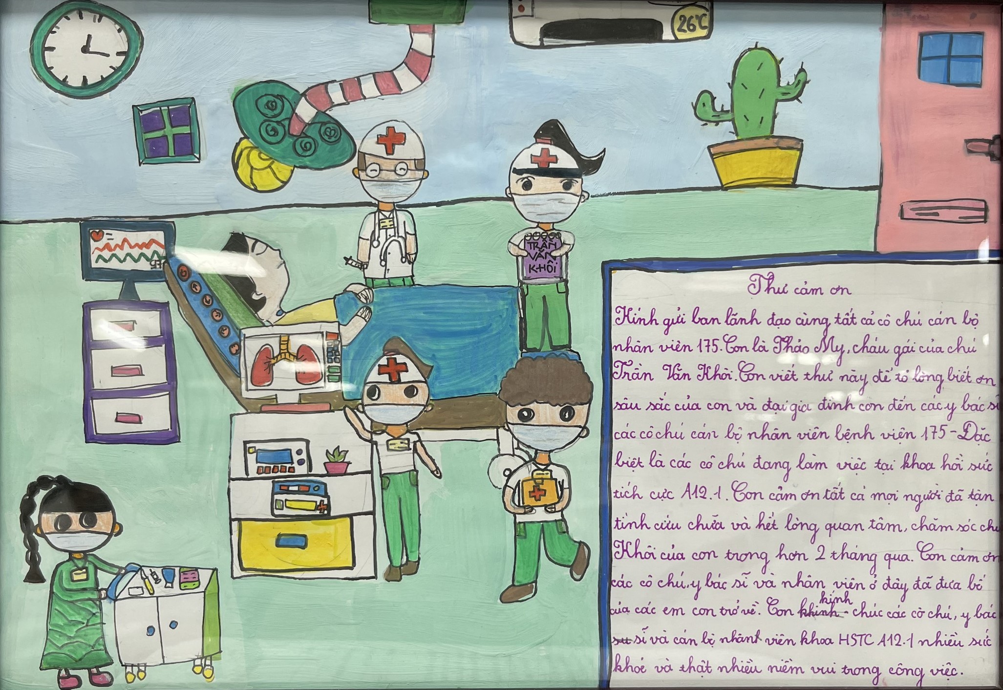 Từ góc nhìn của tuổi thơ, bé Thảo My đã vẽ lại hình ảnh các y bác sĩ đang khẩn trương, tận tình cứu chữa bệnh nhân. Bức tranh cùng những dòng chữ nắn nót, đầy cảm xúc chân thành của bé chính là món quà tinh thần tuyệt vời, vừa là niềm tự hào, vừa là nguồn động lực lớn để các y bác sĩ Khoa Hồi sức tích cực nội nói riêng và Bệnh viện Quân y 175 nói chung không ngừng nỗ lực vững bước trên con đường lương y cao quý.