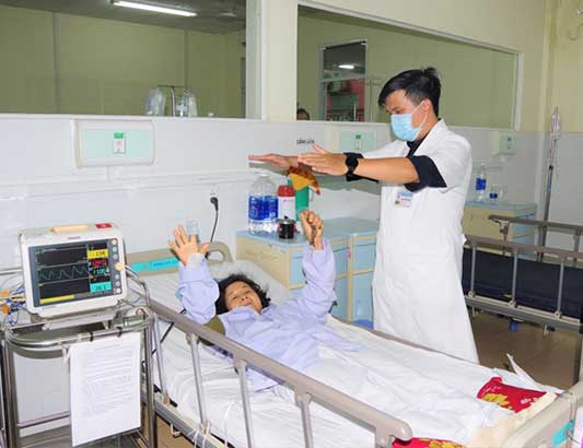 Bệnh nhân đã được thử tập vài động tác vật lý trị liệu kiểm tra ngay trên giường sau khi được can thiệp,