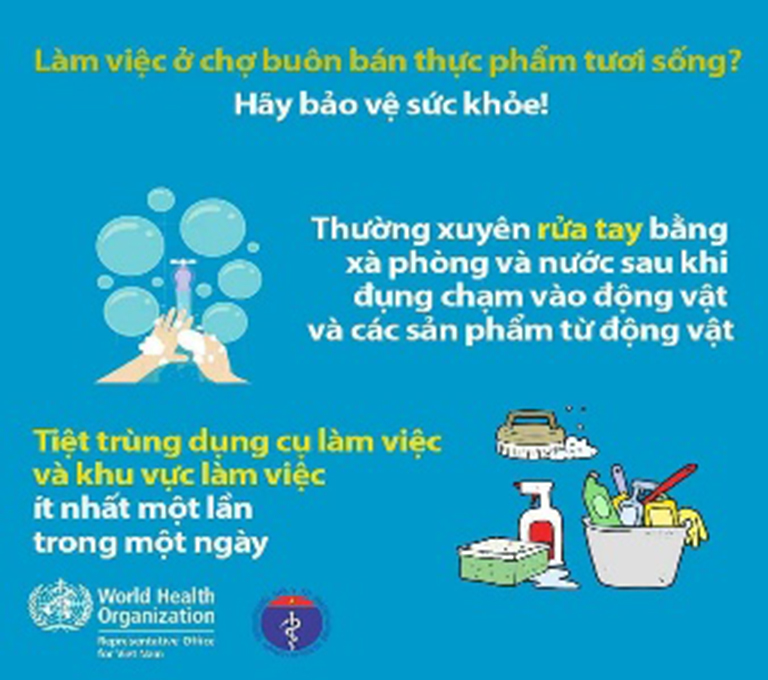 – Sử dụng găng tay, khẩu trang khi đi mua thực phẩm; Không sử dụng thịt vật nuôi bị ôi, hỏng; Tránh xa khu vực chứa chất thải và nước thải trong chợ; Tuyệt đối không tiếp xúc, sử dụng thịt động vật chết do bị bệnh vì đây là những nguồn gây bệnh nguy hiểm.