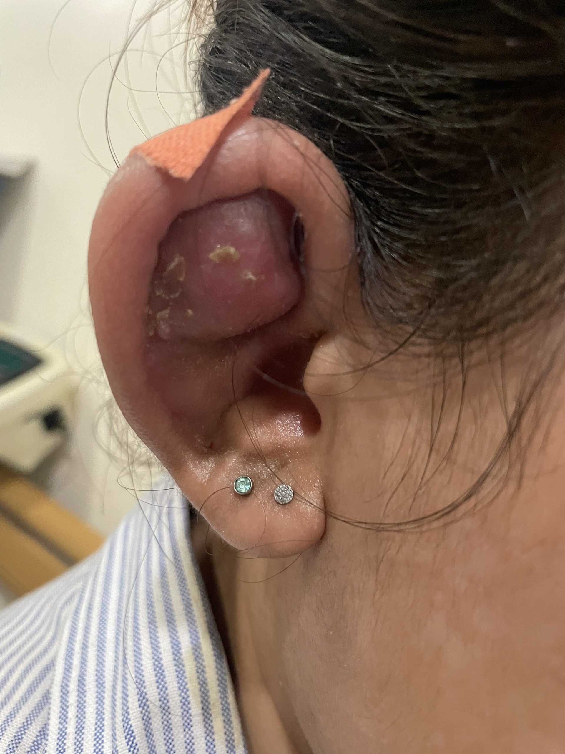 Bệnh nhân nhập viện trong tình trạng sưng đau vành tai sau khi bấm khuyên tai, tại vị trí lỗ xỏ khuyên chảy mủ xanh kèm sốt. Qua khai thác tiền sử và thăm khám tại chỗ phát hiện bệnh nhân bị sưng tấy căng mọng 1 phần vành tai, làm mất các hố, nếp của vành tai, cả mặt trước và sau vành tai, chảy mủ vị trí xỏ khuyên, bệnh nhân được chẩn đoán áp xe sụn vành tai, nguyên nhân do nhiễm trùng sau xỏ khuyên tai dẫn đến hủy một phần sụn vành tai, tiên lượng có thể gây biến dạng vành tai nếu không được điều trị kịp thời.