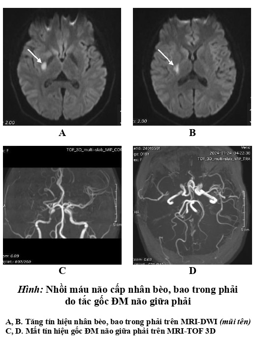 Sau hàng loạt dữ liệu thu thập từ thăm khám lâm sàng và xét nghiệm cận lâm sàng, chẩn đoán xác định được thiết lập: Đột quỵ nhồi máu não cấp vùng nhân bèo, bao trong phải giờ thứ 24 do tắc cấp tính động mạch não giữa phải bởi huyết khối xâm lấn từ túi phình động mạch não giữa phải.