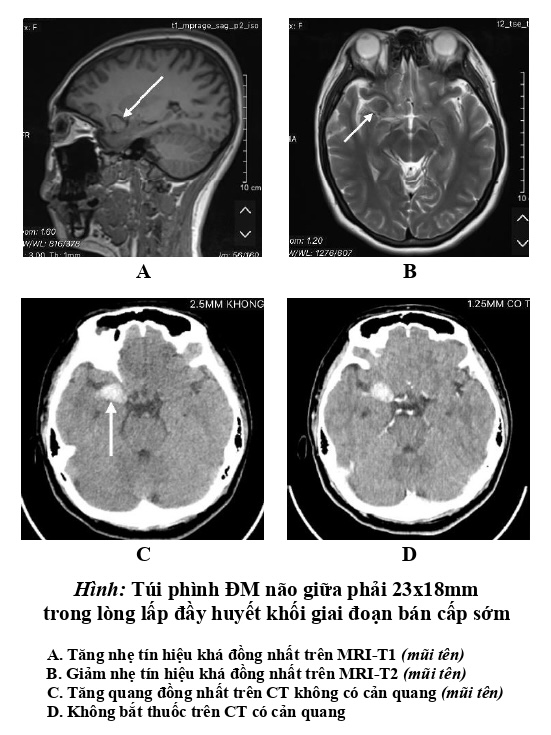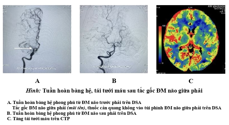 Thời điểm bệnh nhân nhập viện đã quá cửa sổ điều trị tái thông, vì vậy ê-kíp điều trị không đặt ra chỉ định can thiệp nội mạch lấy huyết khối động mạch não giữa bằng dụng cụ cơ học. Một điều may mắn cho người bệnh là khảo sát DSA (chụp mạch máu não kỹ thuật số xoá nền) và CTP (chụp cắt lớp vi tính tưới máu não) cho thấy tuần hoàn bàng hệ đến cấp máu cho động mạch não giữa phía sau chỗ tắc rất phong phú thông qua các vòng thông nối với động mạch não trước và động mạch não sau cùng bên, phần lớn nhu mô não vì thế vẫn được cung cấp máu đầy đủ. Qua phận tích, ê-kíp xác định mục tiêu tối quan trọng là phải bảo toàn hệ thống tuần hoàn bàng hệ này bằng điều trị nội khoa. Phác đồ điều trị được tuyệt đối tuân thủ, bệnh nhân dần ổn định rồi hồi phục khả quan các triệu chứng lâm sàng. Chỉ định phẫu thuật hoặc can thiệp nội mạch điều trị căn nguyên cũng không được ê-kíp điều trị đặt ra bởi với việc đã được lấp đầy bởi huyết khối, túi phình động mạch não giữa của bệnh nhân xem như đã được “bê tông hoá” một cách tự nhiên, không cần can thiệp tác động gì thêm bởi chính điều đó có thể gây hại cho người bệnh, chỉ điều trị bảo tồn và lập kế hoạch theo dõi như khuyến cáo đã đạt đồng thuận cao trong y văn.