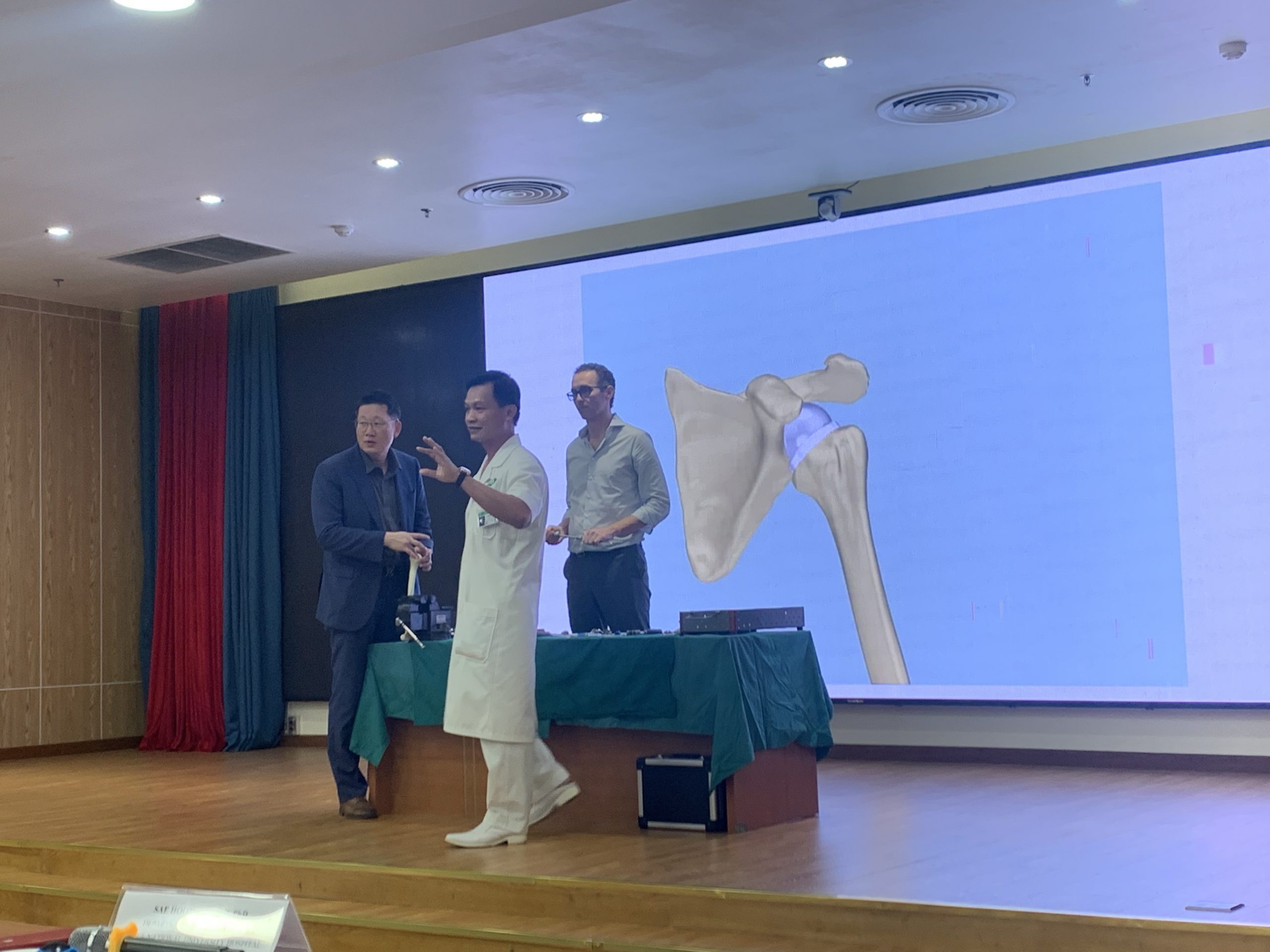 Nằm trong khuôn khổ hội thảo, các chuyên gia và các bác sĩ cũng đã thảo luận các ca lâm sàng thay khớp vai theo giải phẫu và thay khớp vai đảo chiều trên Sawbone.