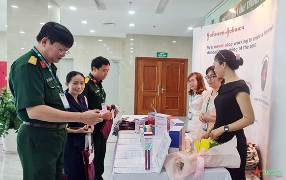 Các đại biểu tham quan, tìm hiểu sản phẩm, thiết bị liên quan đến ung bướu trong khuôn khổ hội nghị.