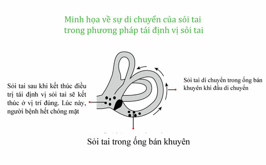 - Phương pháp tái định vị sỏi tai sẽ khiến sỏi tai di chuyển về lại nơi ban đầu từ đó khiến cho chóng mặt kết thúc. Điều đó có thể được thực hiện khi bác sĩ hoặc kĩ thuật viên di chuyển cơ thể và đầu của người bệnh qua một chuỗi các vận động chậm và có kiểm soát. Việc lựa chọn phương pháp tái định vị sỏi tai thích hợp phụ thuộc rất nhiều vào việc xác định được sỏi tai đang ở ống bán khuyên nào và sỏi tai đang trôi hay dính vào vị trí nào trong tai trong.