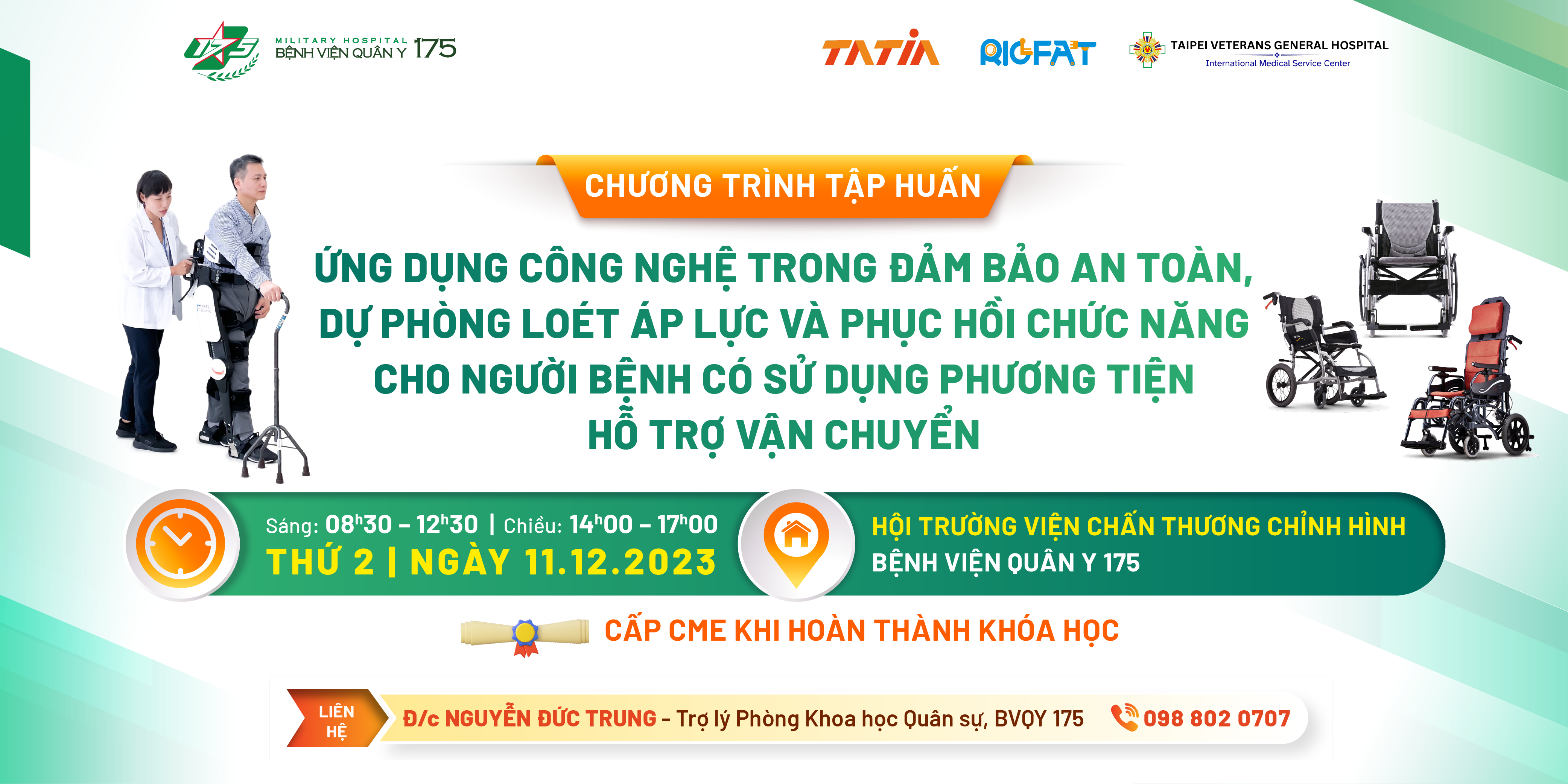 Bệnh viện Quân y 175 phối hợp cùng Trung tâm nghiên cứu về Công nghệ hỗ trợ (RICFAT), Đại học Dương Minh Giao Thông; Trung tâm Dịch vụ Y tế Quốc tế, Bệnh viện Cựu Chiến binh Đài Bắc; Hiệp hội phát triển lĩnh vực Chăm sóc dài hạn và Công nghệ hỗ trợ (TATIA) tổ chức Chương trình Tập huấn về “Ứng dụng Công nghệ trong đảm bảo an toàn, dự phòng loét áp lực và phục hồi chức năng cho người bệnh có sử dụng phương tiện hỗ trợ vận chuyển” sẽ diễn ra ngày 11/12/2023 tại Bệnh viện Quân y 175.