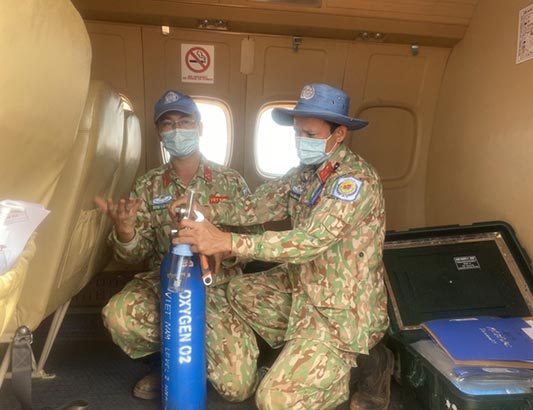 “Ngay khi máy bay hạ cánh, chúng tôi đã trực tiếp cấp cứu bệnh nhân tại chỗ, đo độ bão hòa oxy (SpO2) là 90%, cho bệnh nhân thở oxy, trấn an, động viên và đưa bệnh nhân lên máy bay. Trong chuyến bay, bệnh nhân có biểu hiện mệt và khó thở tăng khi máy bay lên cao, nhưng đã được xử trí kịp thời như tình huống đã hội chẩn cùng các bác sĩ của BVDC 2.3 trước đó” – thượng úy Huỳnh Văn Khánh, thành viên đội AMET, cho biết.