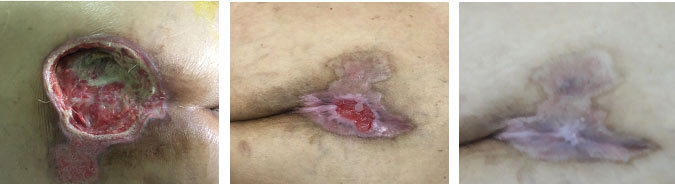 Hình 1. Bệnh nhân nữ, 83 tuổi. Vết loét cùng cụt điều trị thay băng tại chỗ trong 90 ngày