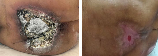 Hình 2. Bệnh nhân nữ, 97 tuổi. Vết loét cùng cụt điều trị trong 150 ngày