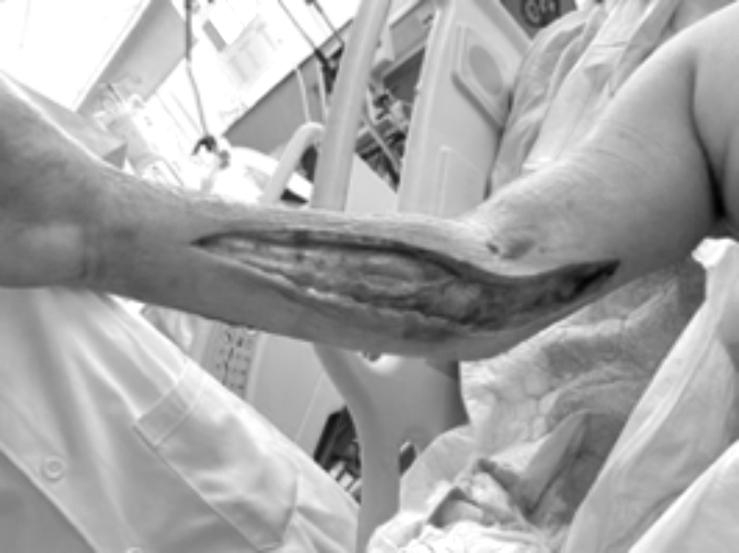 Trước đó, bệnh nhân Nguyễn Thanh T. (26 tuổi), nhập viện cấp cứu là ngày thứ 5 của bệnh với chẩn đoán sốc nhiễm khuẩn đường vào từ viêm mô tế bào cẳng bàn tay phải và gout mạn tính. Với biểu hiện mạch nhanh 130 lần/phút, huyết áp tụt 80/50mmHg, cánh cẳng tay phải sưng nề, ấn lõm, mặt sau 1/3 cánh tay phải có vùng phỏng nước, hoại tử kích thước 5cm, mu tay phải có phù nề, chảy mủ kích thước 2cm. Qua siêu âm, bác sĩ chẩn đoán bệnh nhân bị phù nề tụ dịch mô kẽ, viêm mô tế bào vùng cẳng tay phải.