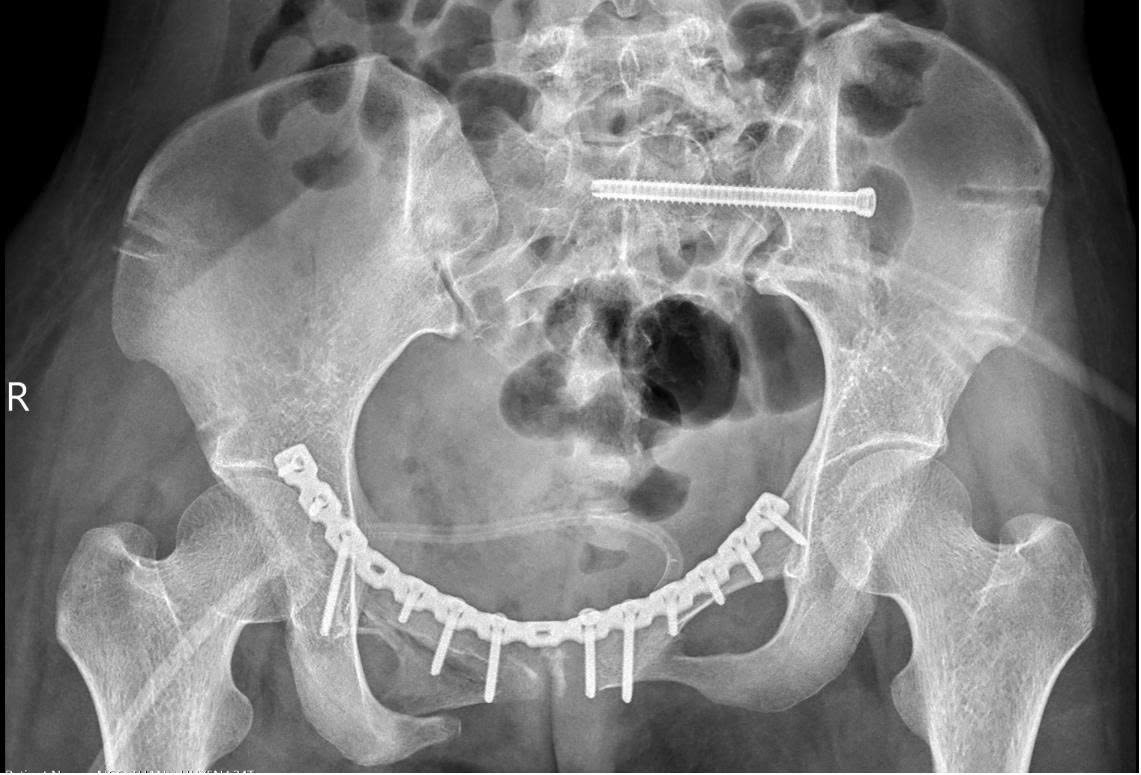 “Vì vậy, mục tiêu điều trị là phục hồi cấu trúc giải phẫu khung chậu và cố định vững chắc bằng nẹp vít, giúp bệnh nhân sớm vận động trở lại. Ở trường hợp này, khung chậu mất vững cả cung trước và sau, nên sau khi nắn chỉnh, chúng tôi cố định cung trước bằng nẹp vít và cung sau bằng vít xốp.” – BS Khanh chia sẻ.