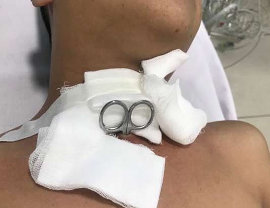 Vào lúc 16 giờ 30 ngày 23, Bệnh viện Quân y 175 tiếp nhận nhận một nam thanh niên tự dùng kéo đâm vào vùng cổ trước. Chiếc kéo dài 20cm đã lún sâu vào trong cổ của bệnh nhân gây thủng khí quản.